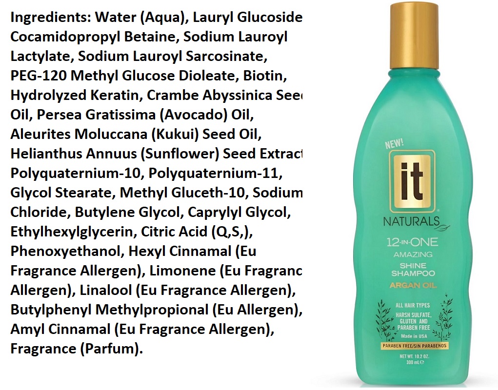 شامپو مغذی و درخشان کننده روغن آرگان آی تی نچرالز It Naturals Shine محصولاتی با کیفیت و حاوی مجموعه ای از عصاره های طبیعی بوده و موهایی سالم و درخشان را به ارمغان می آورد. شامپو آی تی نچرالز شاین حاوی روغن مراکشی خالص، روغن حبشی، روغن نارگیل، روغن آووکادو، کراتین طبیعی، ویتامین B7 و عصاره های گیاهی است. فرمول آبرسان شامپو روغن آرگان آی تی نچرالز شکنندگی موها را کاهش داده، موهای دو شاخه شده را ترمیم کرده و وز و آشفتگی موها را کنترل می کند.