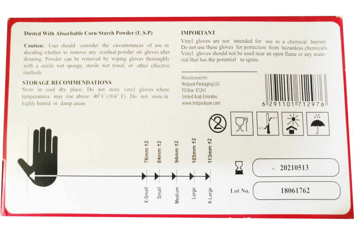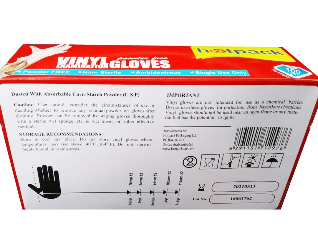 دستکش وینیل هات پک سایز متوسط Hotpack Vinyl Gloves تولیدشده توسط شرکت اماراتی هات پک حاوی 100 عدد دستکش وینیل غیر پودری بهداشتی جهت مراقبت در برابر عوامل بیماری زا می باشد.
