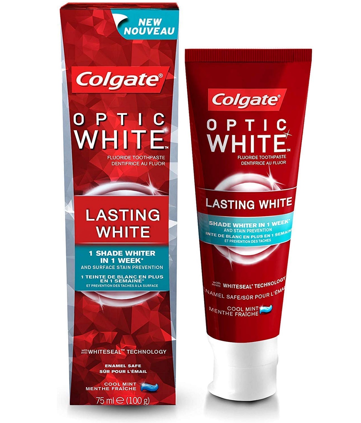 خمیردندان سفیدکننده کلگیت اپتیک وایت Colgate Optic Lasting White محصولی باکیفیت و دارای عملکرد سفیدکنندگی یک درجه ای دندان ها در طی یک هفته بوده و حاوی هیدروژن پروکسید به عنوان ماده موثر پاک کننده جرم های دندان و سفیدکننده می باشد. با استفاده از خمیر دندان سفید کننده کلگیت در یک هفته دندان های شما یک درجه سفیدتر خواهد شد و در چهار هفته نتیجه کامل آن را خواهید دید.