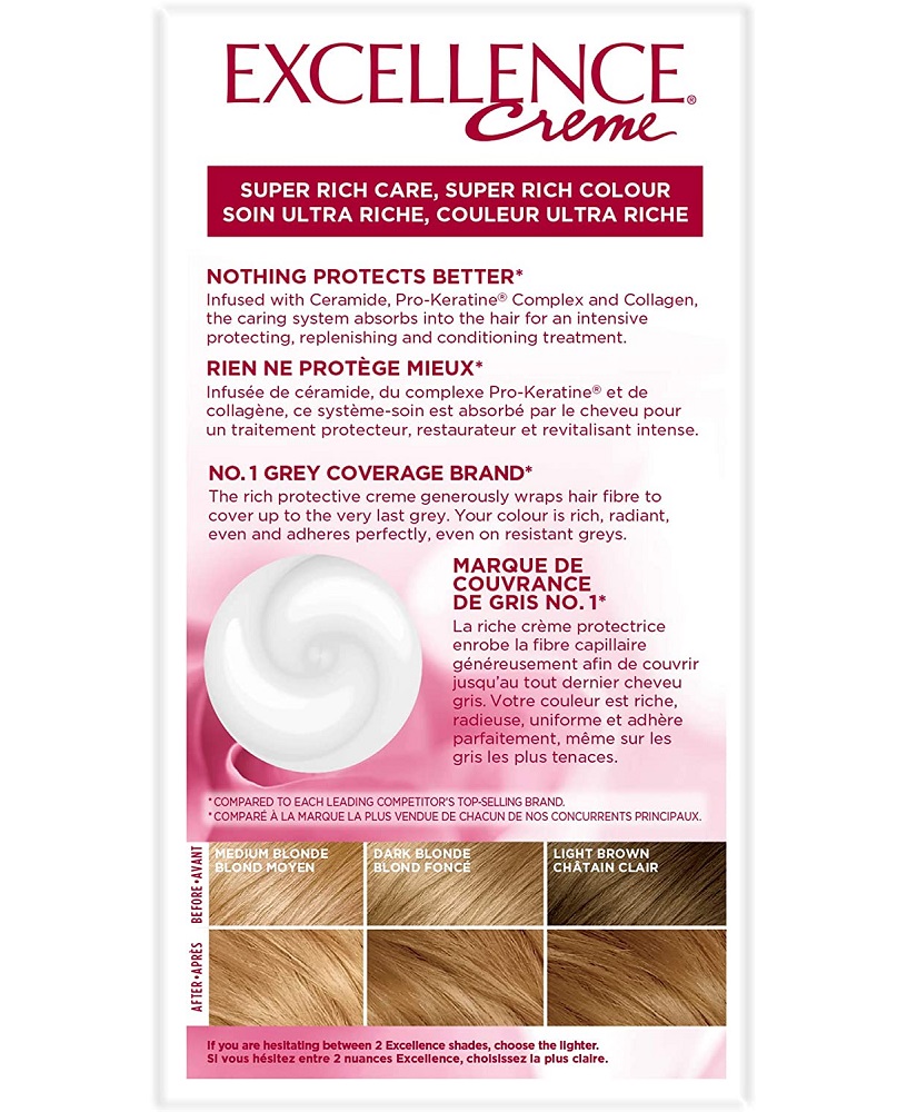 کیت رنگ موی لورال اکسلنس LOreal Excellence دارای سیستم محافظت کننده سه گانه در سه مرحله قبل از رنگ مو، حین رنگ مو و پس از رنگ مو می باشد. در مرحله اول با استفاده از سرم حاوی سرامید موهای شکننده، ضعیف و دارای انتهای خشک را تقویت کرده و با ایجاد لایه محافظ در اطراف آن برای مرحله رنگ مو آن ها را آماده می کند. در مرحله دوم با استفاده از رنگ موی حاوی پرو کراتین تقویت کننده و بازسازی کننده ساختار موهای آسیب دیده و دارای تخلخل می باشد. در پایان با استفاده از نرم کننده حاوی کلاژن نرمی موها را احیا می کند و نتیجه موهایی درخشان با پوشش کامل موهای سفید می باشد.