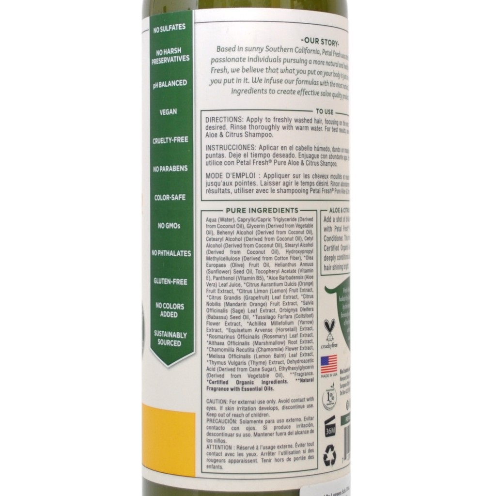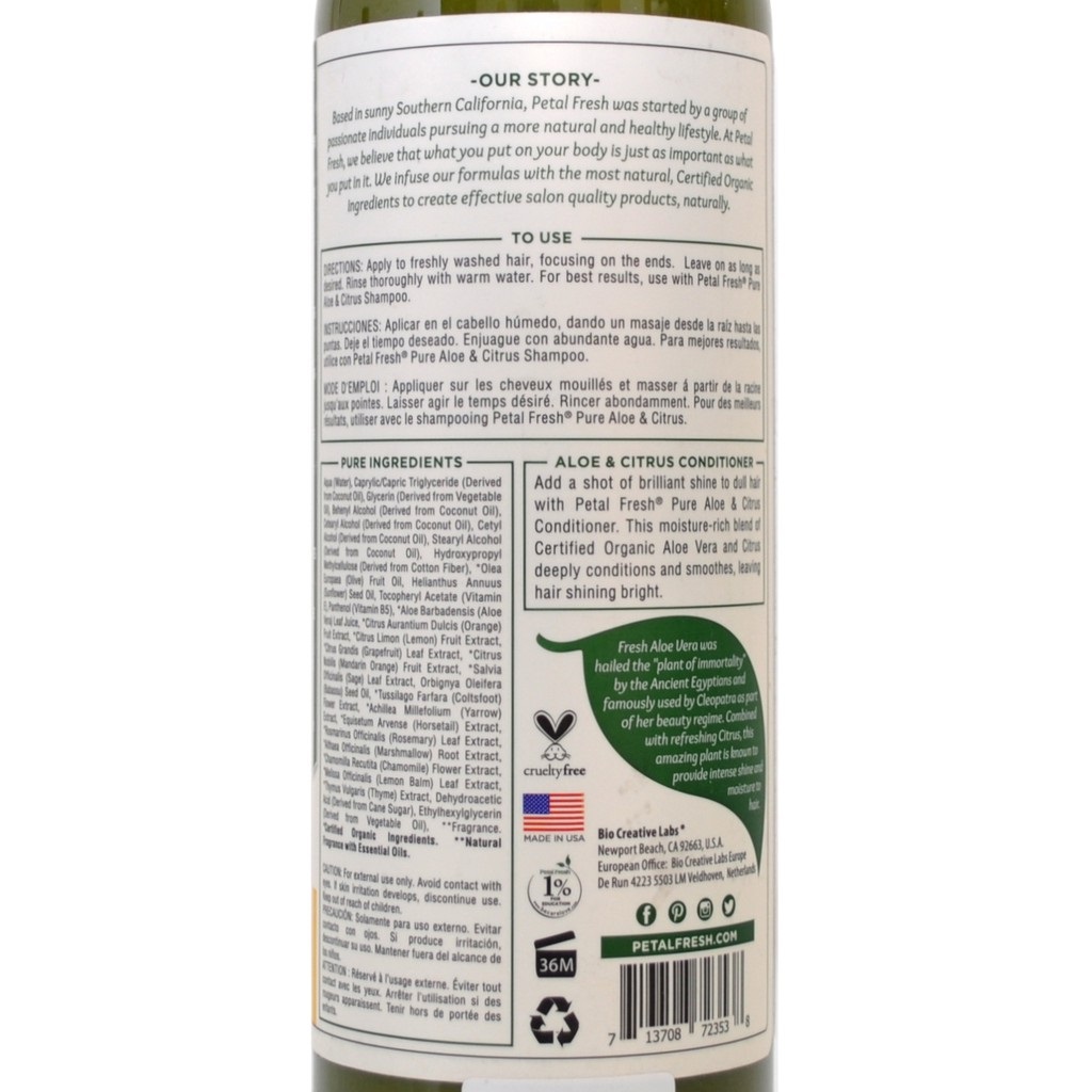 نرم کننده موی آلوئه ورا و مرکبات پتال فرش Petal Fresh Ultra Shine محصولی ارگانیک و باکیفیت است که نرم کننده، مرطوب کننده و درخشان کننده موها می باشد. عصاره آلوئه ورای موجود در نرم کننده موی پتال پتال فرش باعث نرمی و درخشندگی موها می شود و مرکبات نیز سرشار از ویتامین از جمله ویتامین B6 جهت حفظ سلامت موها می باشند. نرم کننده موی پتال فرش فاقد هر گونه ماده مضره شیمایی بوده و از مواد اولیه همچون روغن نارگیل، مریم گلی، گل آفتابگردان، پرتقال ماندارین، گریپ فروت، آلوئه ورا، گیاه پنیرک، بابونه و... می باشد.