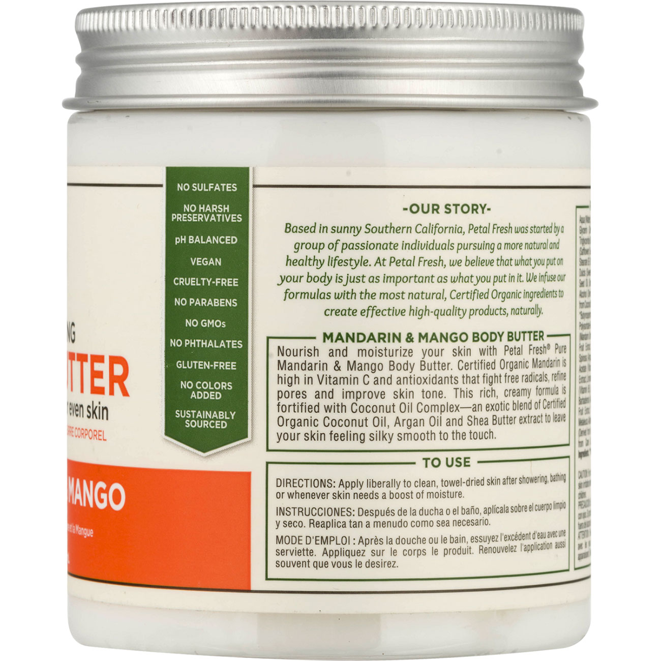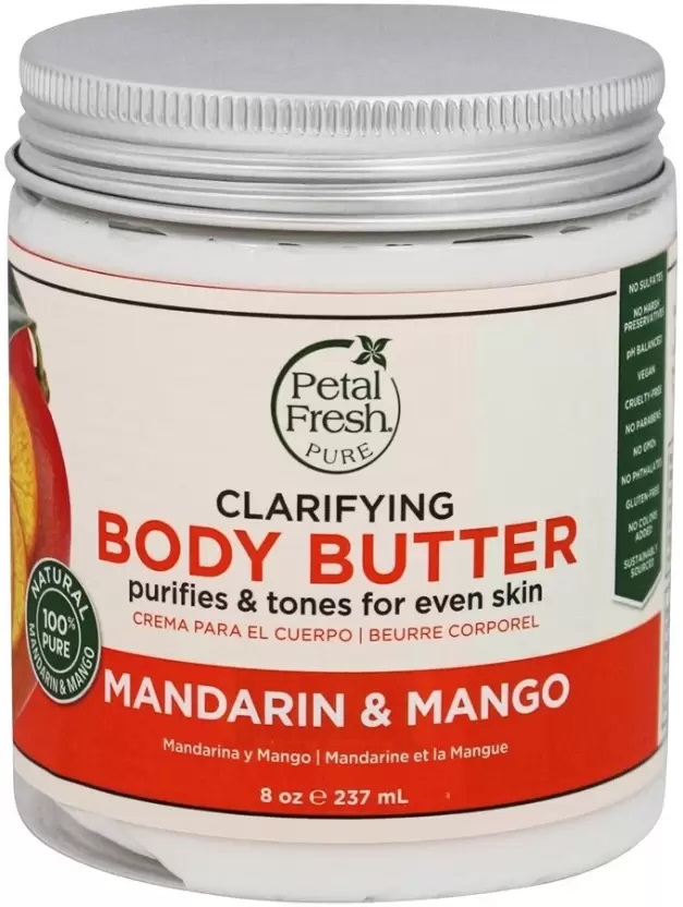 کره روشن کننده بدن پرتقال ماندارین و انبه پتال فرش Petal Fresh Clarifying محصولی باکیفیت و ارگانیک جهت روشن کنندگی، آبرسانی و نرمی پوست می باشد. کره بدن پتال فرش از عصاره های طبیعی از جمله پرتقال ماندارین و انبه ارگانیک دارای گواهی تایید شده تهیه شده است. این ترکیب طبیعی سرشار از ویتامین C و آنتی اکسیدان است که ضمن مقابله با رادیکال های آزاد، شفافیت و روشنایی پوست را افزایش می دهد. کره بدن پتال فرش علاوه بر این به کمک دیگر عصاره های ارگانیک از جمله روغن نارگیل، روغن آرگان و شی باتر باعث نرمی و لطافت پوست می شود. پرتقال ماندارین با خواص ضد میکروب آن شناخته می شود که علاوه بر از بین بردن سموم بدن از پوست در برابر عوامل خارجی محافظت می کند، انبه نیز جهت افزایش شفافیت و روشنایی پوست تاثیر بسزایی دارد. همه این مزایا در کنار رایحه دلپذیر و حس دلنشین استفاده از کره بدن پتال فرش، محصولی دوست داشتنی را در برنامه مراقبت روزانه پوست به ارمغان آورده است.