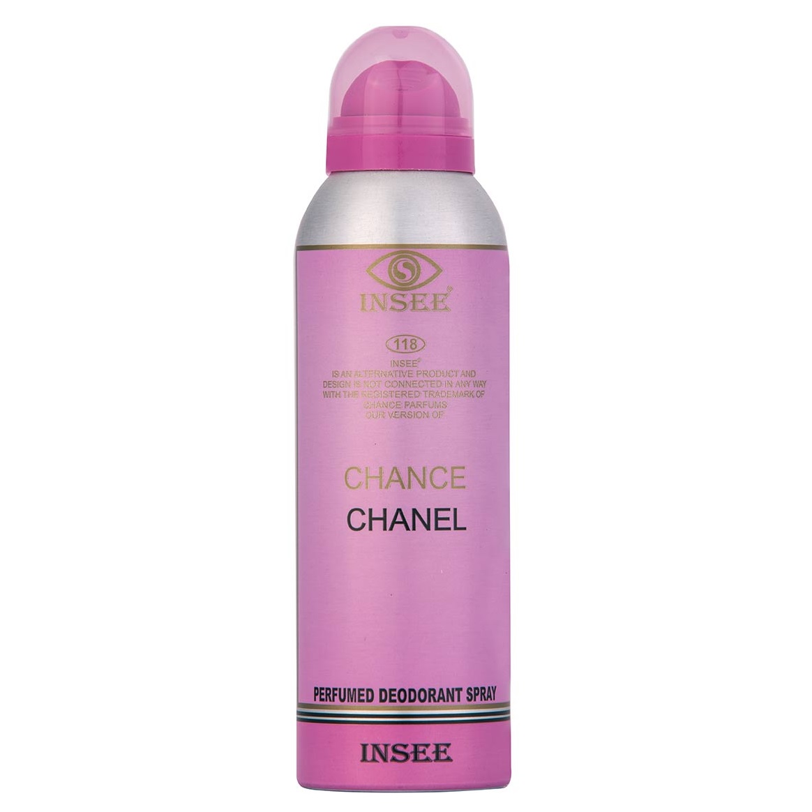 اسپری دئودورانت و خوشبوکننده زنانه برند این سی مدل چنس دارای رایحه ی عطر Chance از برند شانل می باشد. اسپری های خوش بو کننده بدن اینسی برای مدت طولانی بدن شما را کاملا معطر و خوش بو نگه می دارد. همچنین موجب ایجاد لکه بر روی لباس ها نمی گردد.