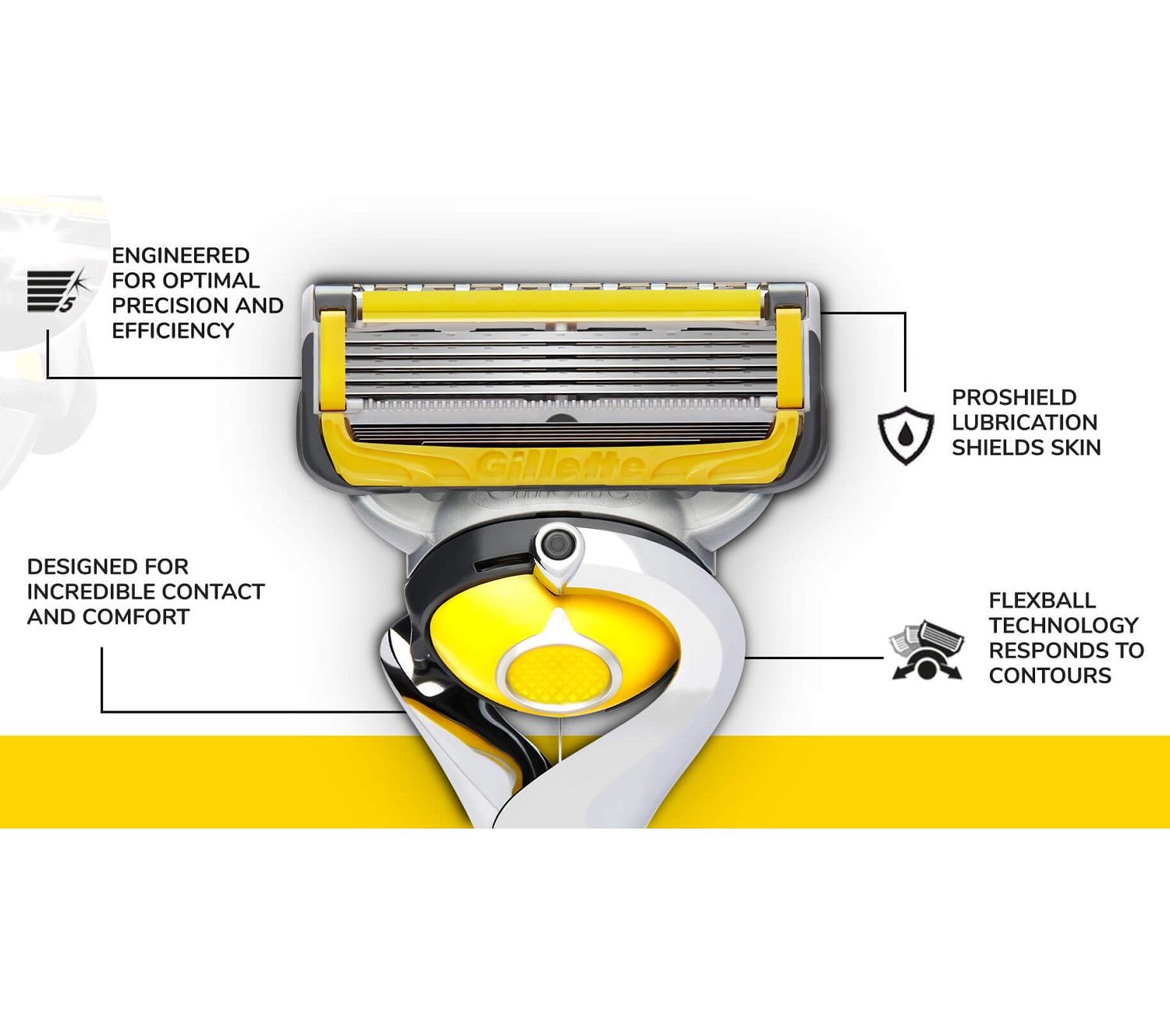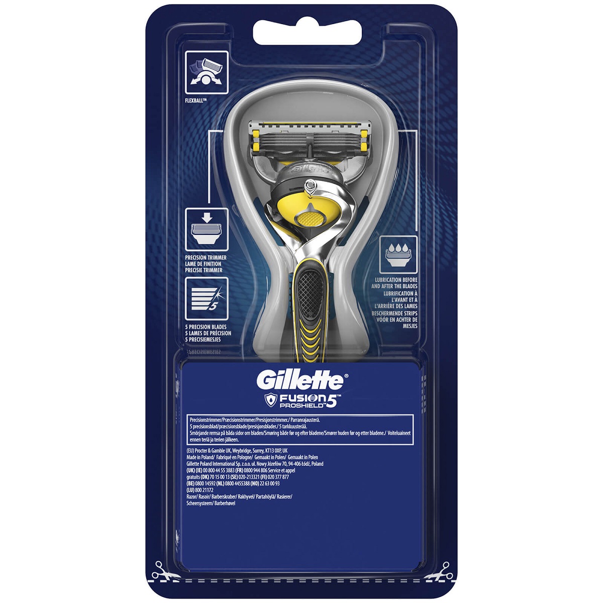 خودتراش ژیلت فیوژن پروشیلد Gillette Fusion Proshield محصول جدید و حرفه ای از سوی ژیلت بوده که دارای مزایای فراوان است. ژیلت فیوژن پروشیلد دارای مهندسی دقیق طراحی است که همه آنچه برای یک اصلاح کامل نیاز است را در خود جای داده است. این خودتراش دارای دو لایه نوار ژل در بالا و پایین جهت نرم کنندگی و آماده سازی پوست قبل از اصلاح و تسکین پوست بعد از اصلاح است. علاوه بر نوار ژل بیشتر نسبت به مدل قبلی ژیلت یعنی فیوژن پروگلید با دارا بودن آلوئه ورا برای پوست های حساس نیز مناسب می باشد. فیوژن پروشیلد دارای تکنولوژی فلکس بال جهت حداکثر تماس تیغ با ریشه مو می باشد. فلکسبال بهراحتی روی استخوان فک و گونهها میلغزد و بهسرعت و با راحتیِ بینظیری تمام موها را از ریشه میکند. سر خودتراش فلکسبال این قابلیت را دارد که به طرفین بچرخد و نیازی نیست دستهی خودتراش چرخانده شود. علاوه بر این وزن سبک تر پروشیلد، دارا بودن میکرو دندانه های شانه ای جهت آماده سازی مو قبل از اصلاح و طراحی دقیق پنج لبه محصولی حرفه ای را به ارمغان آورده است.