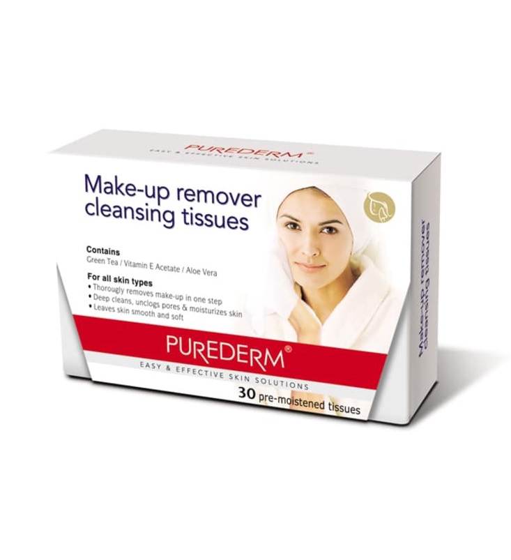 دستمال مرطوب پاک کننده آرایش پیوردرم Purederm Makeup Remover حاوی چای سبز به همراه ویتامین E و آلوئه ورا است و پاک کننده کامل انواع آرایش چشم، صورت و لب و آرایش ضد آب می باشد. دستمال مرطوب پیور درم ضمن پاک کردن آرایش و منافذ پوست در یک مرحله، پوست را آبرسانی کرده و توسط آلوئه ورا آن را تسکین می دهد، همچنین ویتامین E نیز دارای خواص ضدپیری و تغذیه کنندگی پوست می باشد.