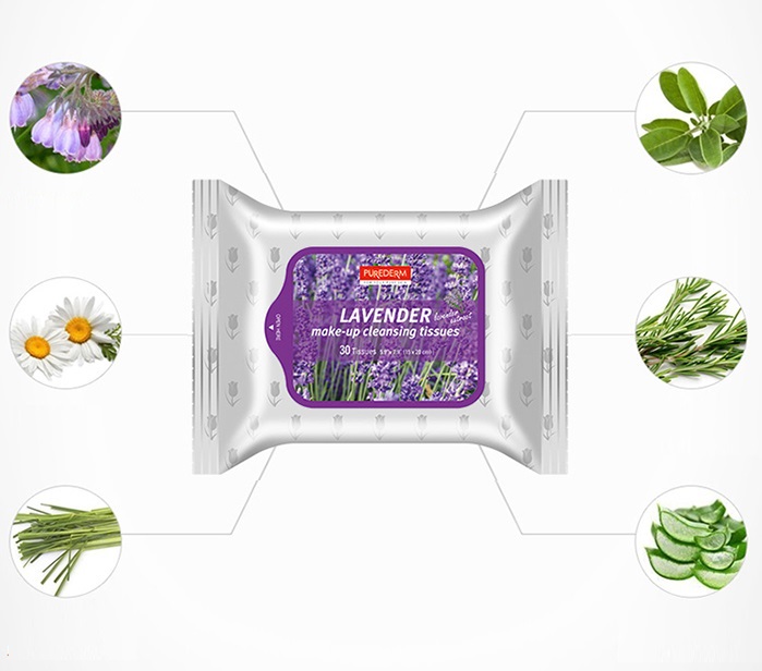 دستمال مرطوب پاک کننده آرایش پیوردرم Purederm Makeup Remover حاوی عصاره لاوندر جهت مراقبت ویژه از پوست های حساس بدون ایجاد حساسیت به همراه ویتامین E است و پاک کننده کامل انواع آرایش چشم، صورت و لب و آرایش ضد آب می باشد. دستمال مرطوب پیور درم ضمن پاک کردن آرایش و منافذ پوست در یک مرحله، پوست را آبرسانی کرده و همچنین ویتامین E نیز دارای خواص ضدپیری و تغذیه کنندگی پوست می باشد.