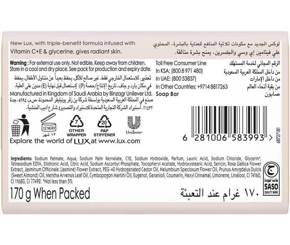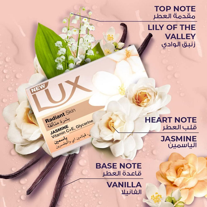 صابون لوکس رایحه گل یاس LUX Radiant Skin Jasmine دارای فرمول جدید برای پاک کنندگی ملایم و لطیف پوست به همراه سه عملکرد روشن کنندگی، رطوبت رسانی و تغذیه کنندگی می باشد. صابون لوکس رادیانت اسکین حاوی ویتامین سی برای روشن کنندگی و کاهش تیرگی پوست، ویتامین E برای تغذیه و محافظت پوست و گلیسیرین برای رطوبت رسانی و افزایش ماندگاری رطوبت در بافت پوست است. این ترکیب فوم غنی کرمی و لطیف ایجاد می کند و دارای رایحه آغازین گل زنبق دره، رایحه میانی گل یاس و رایحه پایانی وانیل است و پوست خوشبوی طولانی مدت را به ارمغان می آورد.