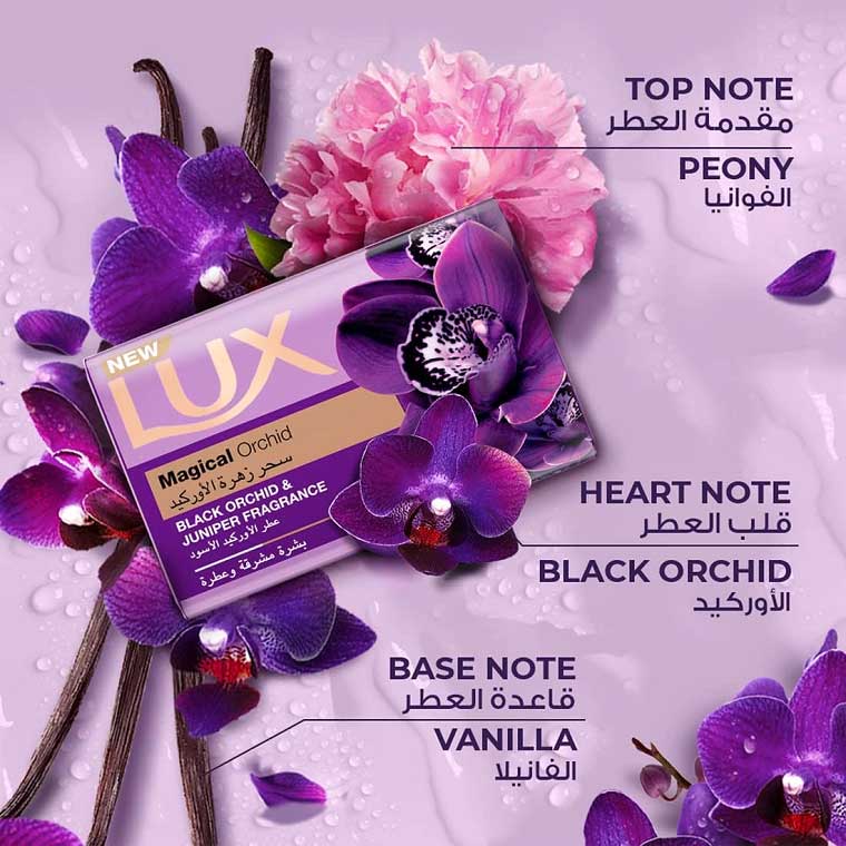 صابون لوکس رایحه گل ارکیده LUX Magical Beauty دارای فرمول جدید برای پاک کنندگی ملایم و لطیف پوست به همراه روغن های مغذی و تغذیه کننده می باشد. صابون لوکس مجیکال ارکید حاوی روغن بادام برای تغذیه پوست، روغن گل نیلوفر آبی برای لطافت و مراقبت پوست و روغن نعناع و روغن علف لیمو برای شادابی و طراوت است. این ترکیب فوم غنی کرمی و لطیف ایجاد می کند و دارای رایحه آغازین شکوفه گل رز پئونی، رایحه میانی گل ارکیده سیاه و میوه درخت ارس (جونیپر) و رایحه پایه وانیل است و پوست خوشبوی طولانی مدت را به ارمغان می آورد.