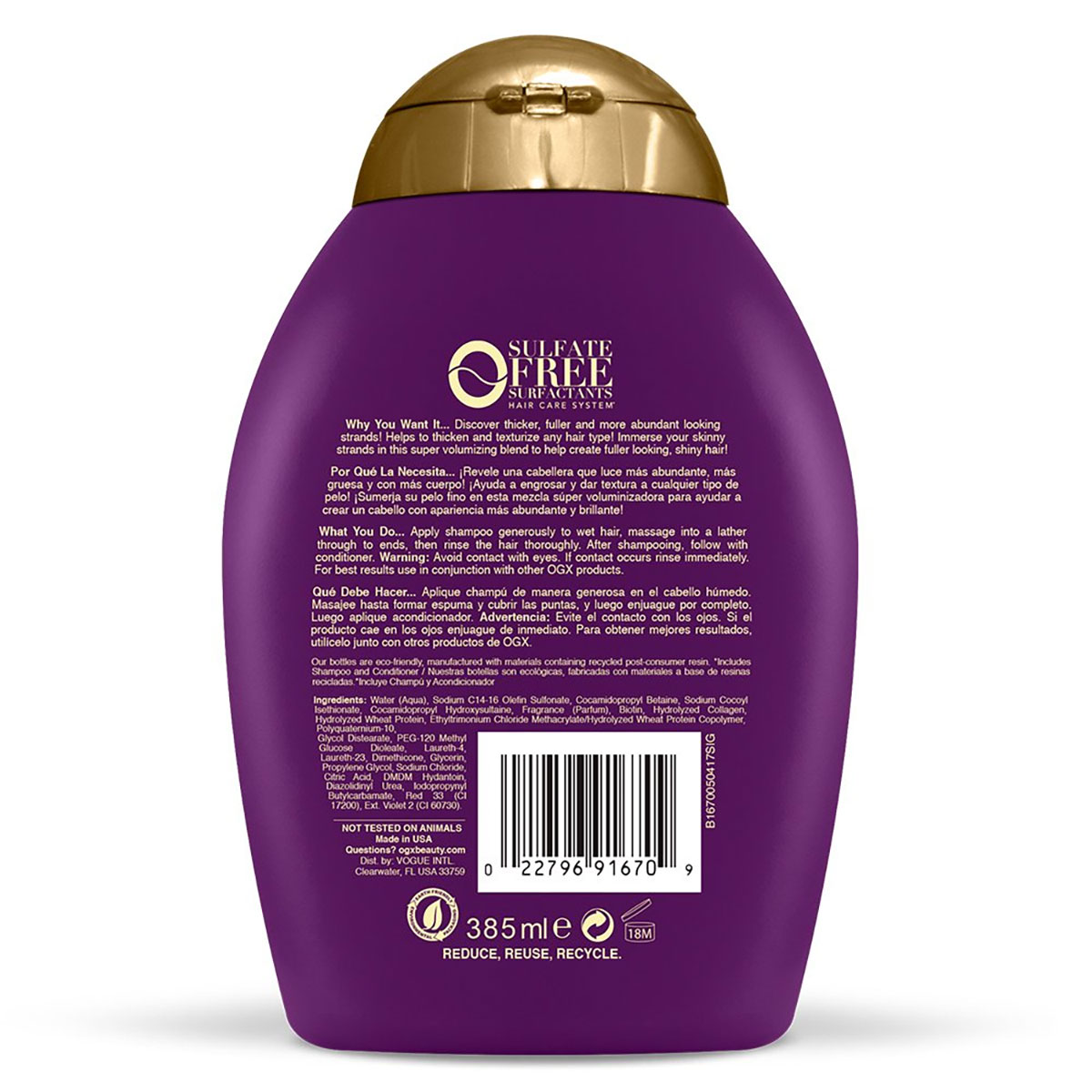 شامپو ضخیم کننده و حجم دهنده بیوتین و کلاژن او جی ایکس Ogx Biotin Collagen دارای فرمول انحصاری ویتامین B7 (بیوتین) به همراه کلاژن و پروتئین گندم هیدرولیز شده جهت رساندن مواد مغذی به هر رشته از موها و ایجاد موهایی ضخیم تر، پرحجم تر و سالم تر می باشد. بیوتین به افزایش استحکام مو کمک می کند و کلاژن نیز با تغذیه ساختار مو موجب افزایش حجم مو می شود و نتیجه موهایی سالم و درخشان خواهد بود.