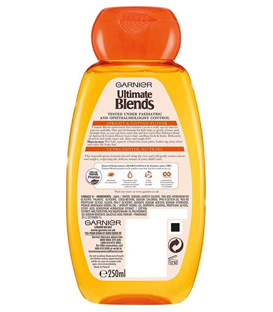 شامپو 2 در 1 کودک گارنیه حاوی زردآلو و گل کتان Garnier Ultimate Blends حاوی شامپو و نرم کننده و دارای فرمول ملایم و بدون آلرژی جهت محافظت از مو و پوست حساس کودکان می باشد. شامپو کودک گارنیه حاوی عصاره زردآلو با رایحه دلپذیر و گل کتان جهت نرمی موها بوده و ضمن منظم کردن موهای درهم و گره خورده، رایحه ماندگار را به همراه دارد.