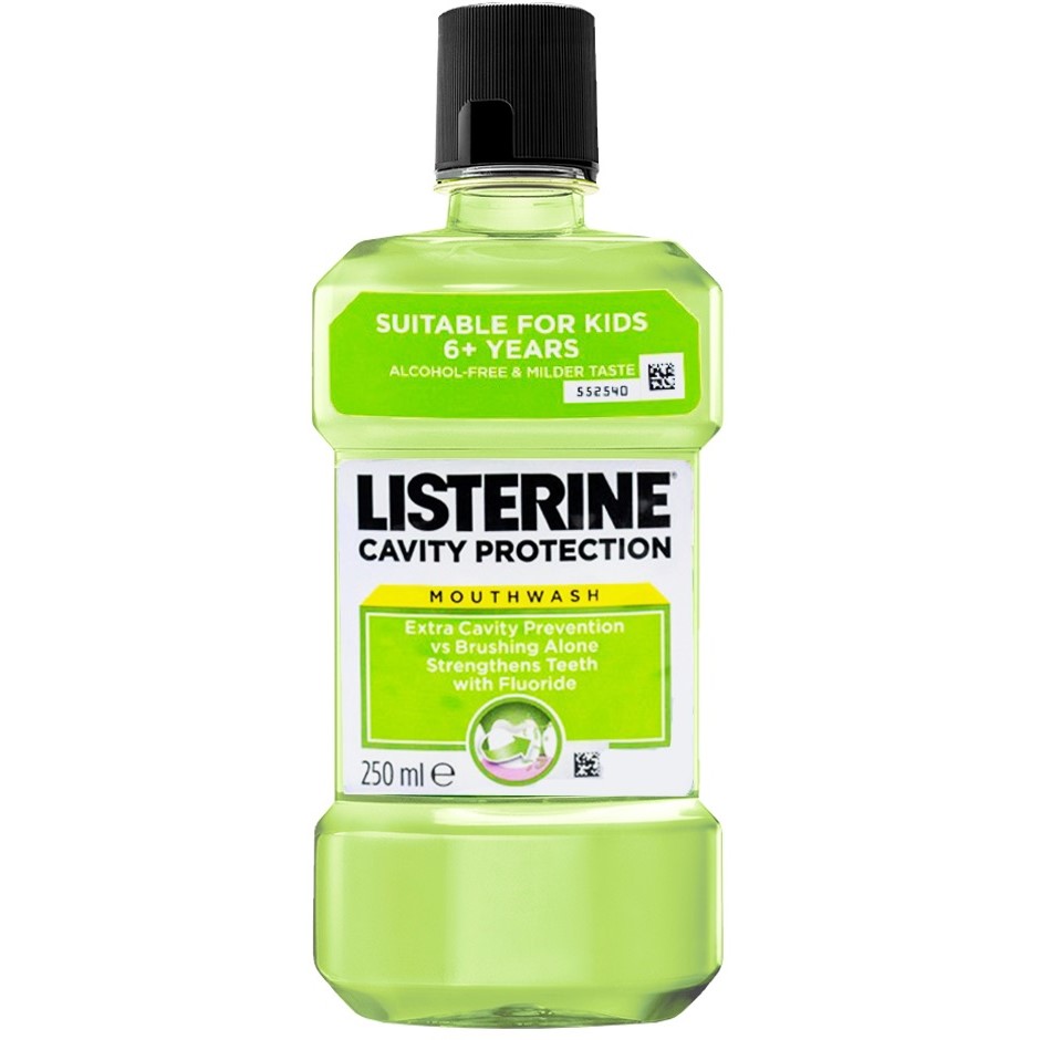دهانشویه ضد پوسیدگی لیسترین Listerine Cavity Protection با فرمولاسیون بدون الکل دارای خاصیت آنتی سپتیک (ضد میکروب) بوده و از بین برنده 99 درصد میکروب های ایجاد کننده بوی بد تنفس می باشد. دهانشویه لیسترین کویتی پروتکشن حاوی فلوراید بیشتر جهت استحکام بخشی دندان و محفاظت در برابر پوسیدگی دندان ها می باشد و علاوه بر این دارای طعم ملایم است که علاوه بر بزرگسالان برای کودکان 6 سال و بالاتر نیز مناسب است.