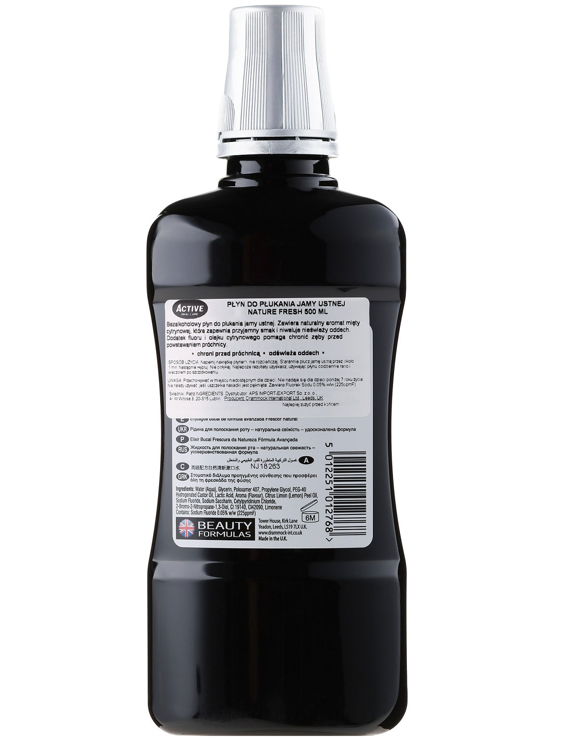دهانشویه بیوتی فرمولا Beauty Formulas Nature Fresh دارای فرمولاسیون بدون الکل و حاوی روغن لیمو جهت تازگی بخشی و مقابله با بوی بد تنفس است و علاوه بر این با استفاده از فلوراید باعث افزایش استحکام دندان و مقابله با پوسیدگی دندانی می شود.