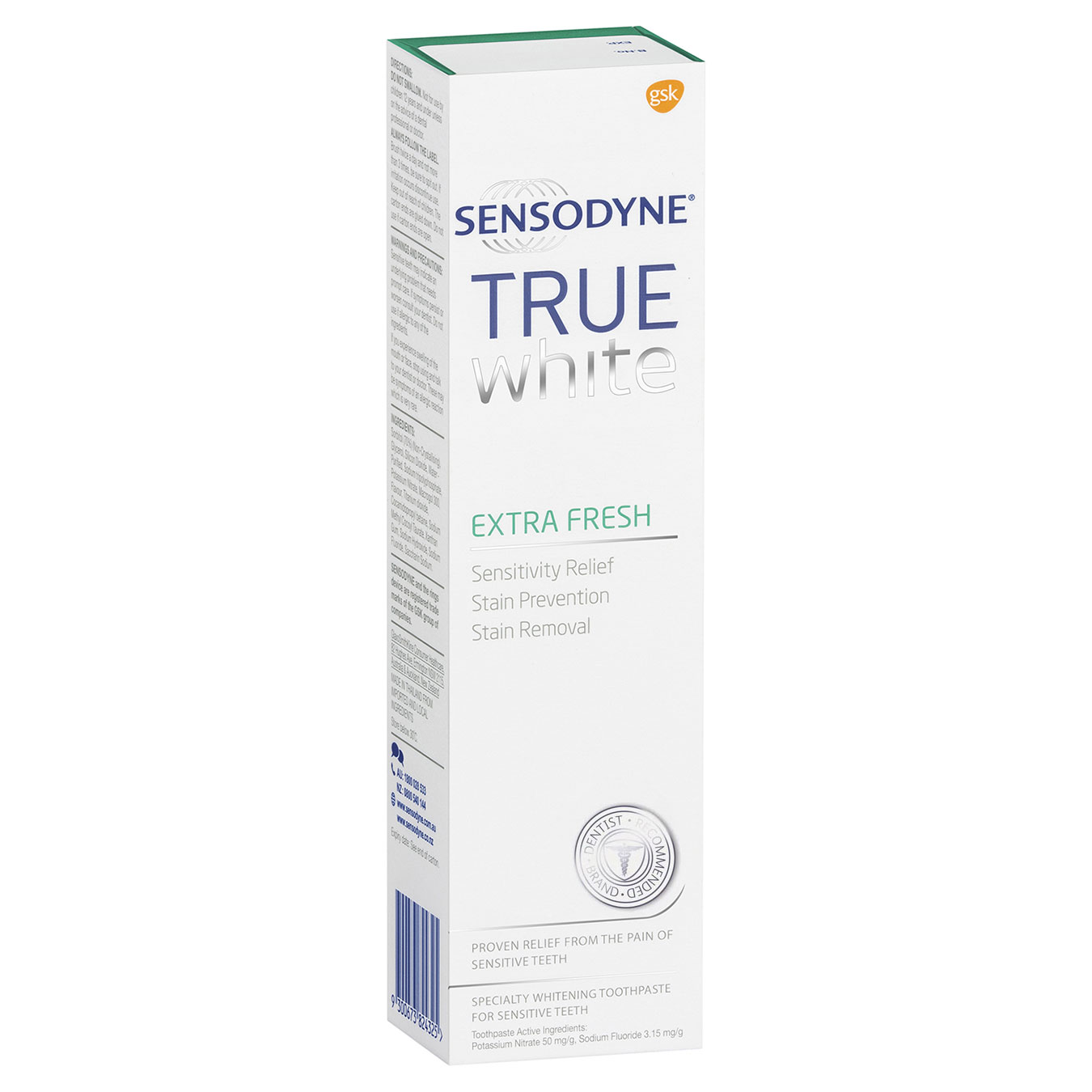 خمیردندان سفیدکننده سنسوداین ترو وایت Sensodyne True White Extra Fresh دارای فناوری پیشرفته جهت سفیدکنندگی دندان های حساس است. خمیردندان ترو وایت سنسوداین دارای دو ویژگی همزمان است که ضمن تسکین دندان های حساس و رفع حساسیت های دندانی، سفیدکننده و استحکام بخش دندان است. خمیردندان ترو وایت سنسوداین حاوی مواد موثر پتاسیم نیترات جهت جذب مواد ناخالصی و جرم های دندانی با حفظ لایه محافظ مینای دندان و سدیم فلوراید است و به کمک فناوری سنسوداین 10 برابر میزان سایش کمتر مینای دندان را نسبت به بیشتر محصولات سفیدکننده دیگر موجود در بازار را دارد. خمیردندان سفیدکننده سنسوداین همچنین بدون سولفات بوده و محافظت کننده دندان در برابر پوسیدگی می باشد.