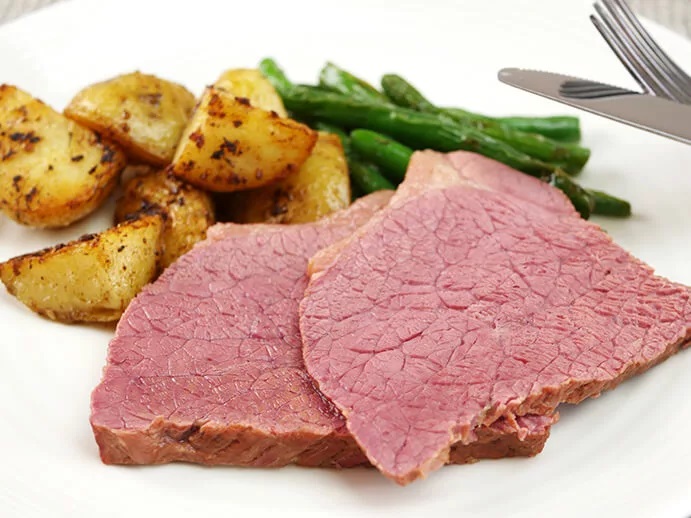 کورن بیف گوشت گاو نمک سود شده توسط سنگ دانه های درشت نمک به نام کورن می باشد. اگر به دنبال یک دستورالعمل سریع برای نهار یا شام هستید، کورن بیف امریکن گاردن که حاوی بیف و بیف پخته شده است گزینه مناسبی است، کافی است بیف را بر روی حرارت بگذارید تا قهوه ای شود، میتونید آن را به همراه سبزیجات و آب لیموی طبیعی میل کنید.