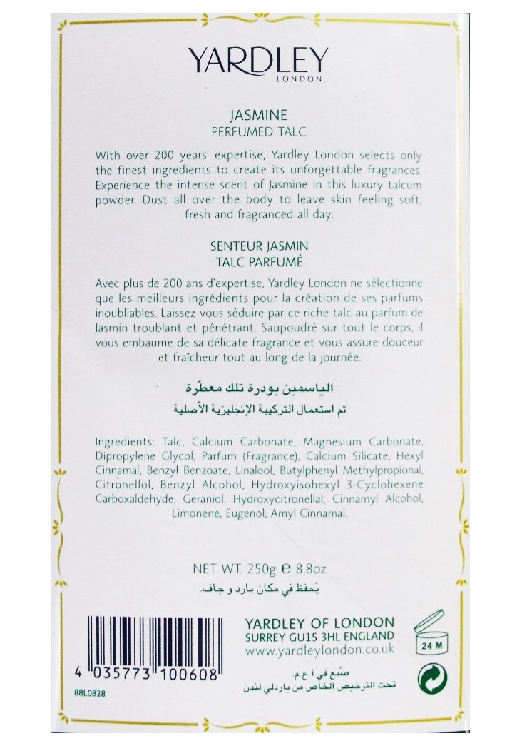 پودر خوشبوکننده بدن یاردلی رایحه گل یاس سلطنتی Yardley Imperial Jasmine محصولی بسیار خوب جهت نرمی و تازگی بدن همراه با رایحه دلپذیر ماندگار در تمام طول روز می باشد. پودر بدن یاردلی حاوی پودر تالک پرمیوم همراه با دستچینی از بهترین گل های یاس پرورش یافته انگلیسی است، کافی است پس از استحمام مقداری از پودر را بر روی همه بدن پخش کنیم و از لطافت و رایحه دل انگیز ماندگار آن لذت ببریم.