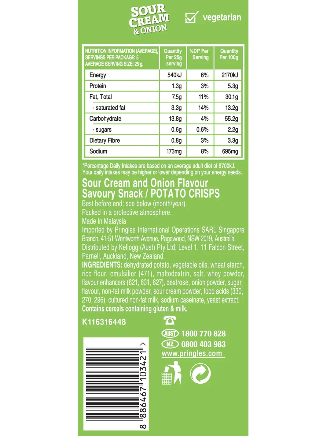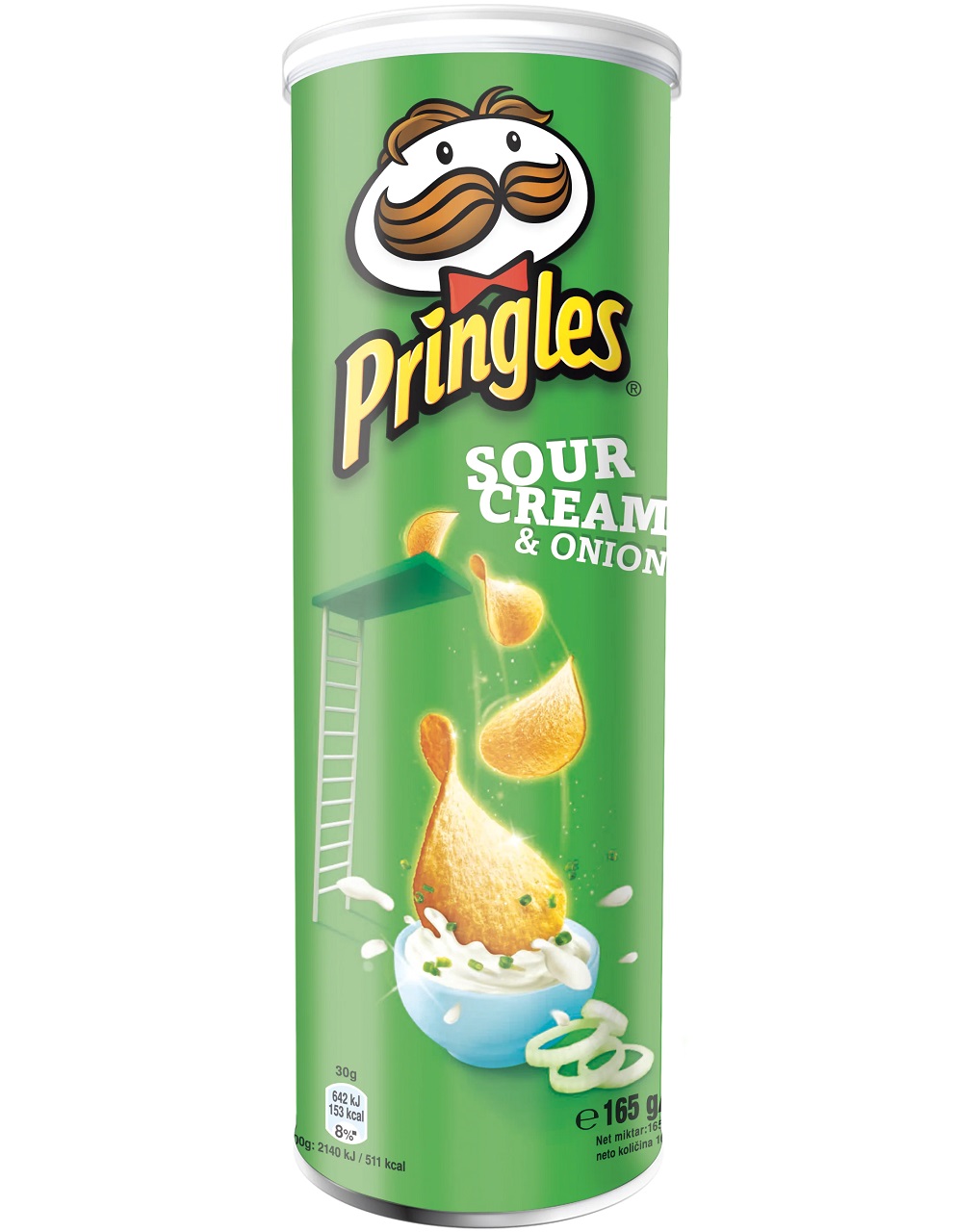 چیپس پرینگلز Pringles Sour Cream and Onion تهیه شده از سیب زمینی باکیفیت دارای طعم خامه ترش و پیاز است.