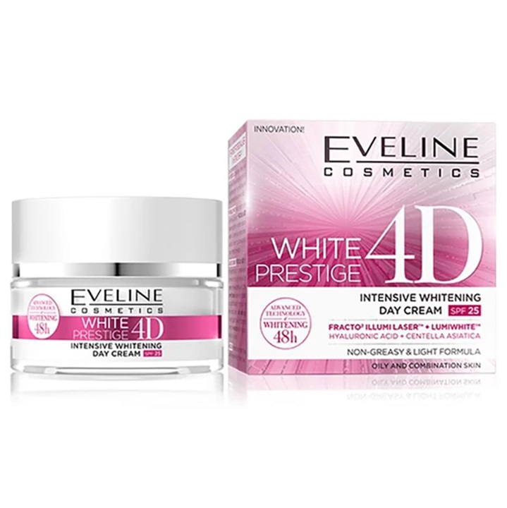کرم روشن کننده روز اولاین وایت پرستیژ Eveline White Prestige 4D حاوی هیالورونیک اسید جهت آبرسانی قوی به همراه کمپلکس ضد لک و روشن کننده LumiskinTM 4D و عصاره گیاه سنتلا آسیاتیکا است. کمپلکس روشن کننده اولاین ضمن مقابله با تولید ملانین که منجر به ایجاد لک و نقاط قهوه ای می شود، با کاهش ناحیه های دو رنگ و لک باعث افزایش روشنایی و شفافیت پوست می شود.