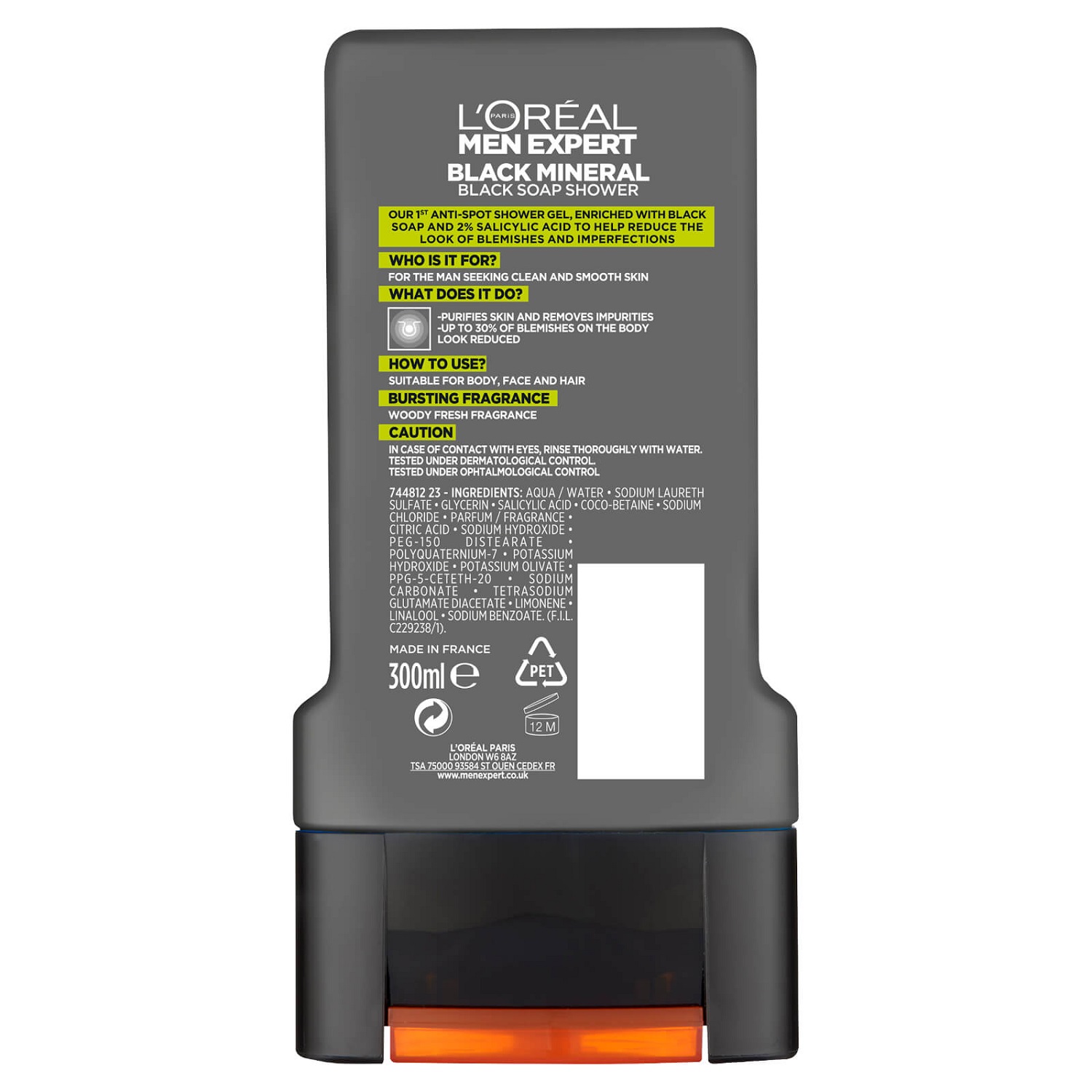 ژل دوش ضدجوش آقایان لورال بلک مینرال LOreal Black Mineral حاوی فرمولاسیون ویژه جهت کاهش جوش بدن و تسکین دهندگی بوده و دارای سه کاربرد است که برای استفاده بدن، صورت و مو مناسب می باشد. ژل دوش لورال بلک مینرال غنی شده با صابون سیاه و حاوی 2 درصد سالیسیلیک اسید است که تا 30 درصد ظاهر جوش های بدن را کاهش می دهد، علاوه بر این توسط رایحه چوبی حس دلپذیری را فراهم می کند.