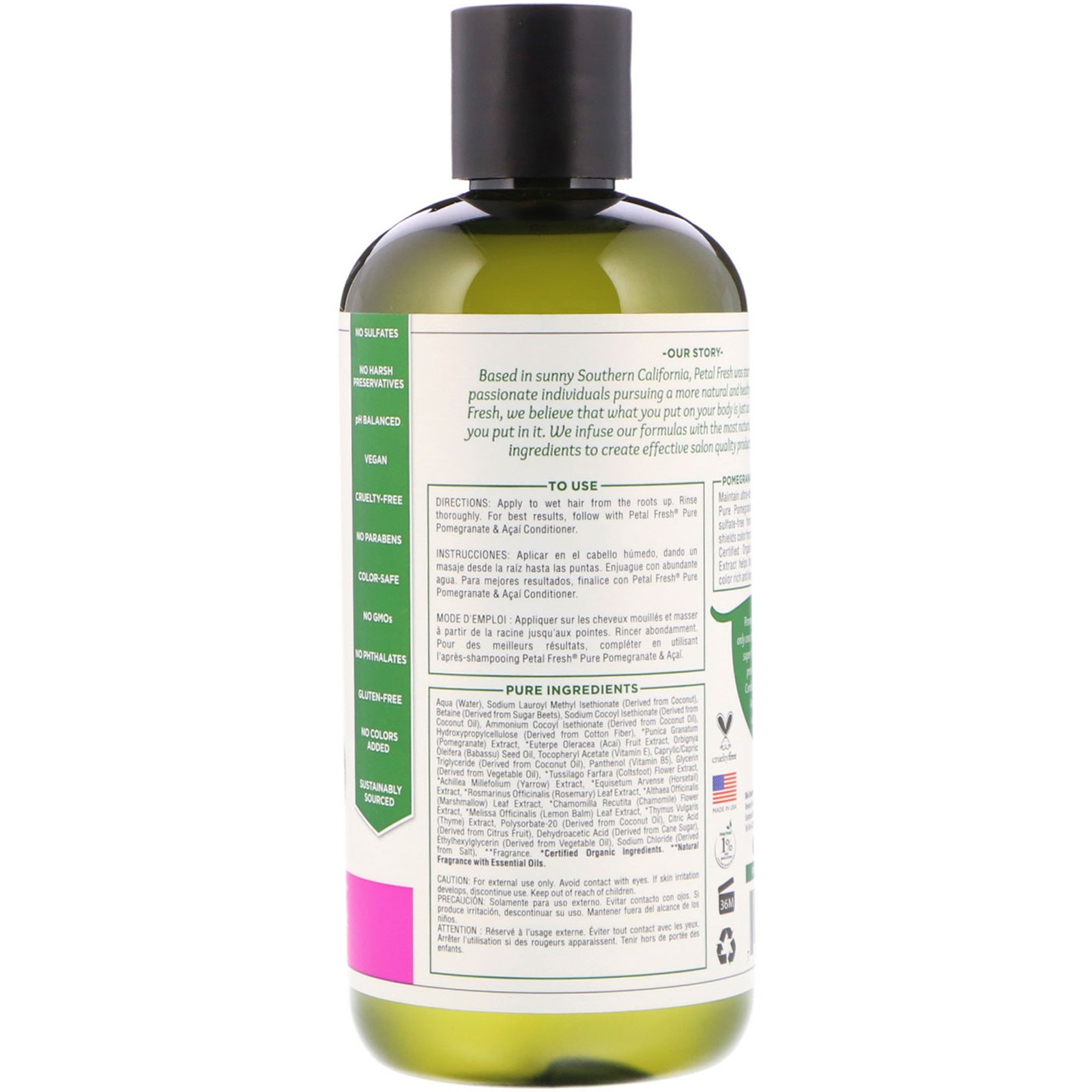 شامپو موهای رنگ شده پتال فرش انار و نخل آسای Petal Fresh Color Protection محصولی باکیفیت و حاوی فرمول ملایم و بدون مواد مضره از جمله، سولفات، مواد نگهدارنده، رنگ مصنوعی و... بوده و ضمن ترمیم و بازسازی کیفیت و نرمی موهای رنگ شده از مات شدن رنگ مو جلوگیری می کند. شامپو موهای رنگ شده پتال فرش حاوی عصاره های طبیعی پرورش یافته به صورت ارگانیک و گواهینامه دار انار و نخل آسای است که محافظت کننده رنگ دانه های مو و درخشان کننده رنگ مو می باشند. انار و آسای بری از میوه های سوپر فودز هستند و هر دو سرشار از آنتی اکسیدان با خواص ترمیم کننده و محافظت از کیفیت و درخشندگی موها می باشند.