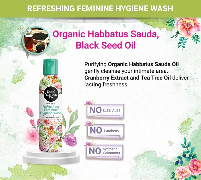 شوینده بهداشتی بانوان گود ویرچیوز کو Good Virtues Co Refreshing حاوی روغن ارگانیک سیاه دانه غنی از مواد مغذی و آنتی اکسیدان جهت پاک کنندگی ملایم ناحیه تناسلی به همراه محافظت از سلامتی و متعادل سازی pH واژن می باشد. شوینده بانوان گود ویرچیوز همچنین حاوی روغن درخت چای و عصاره کرن بری با خواص شادابی بوده که تازگی بخش است و حس آسودگی طولانی مدت را به همراه دارد.