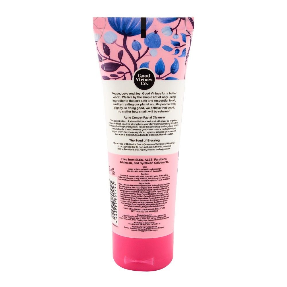 ژل پاک کننده ضدجوش گود ویرچیوز کو Good Virtues Co Acne Control حاوی روغن ارگانیک سیاه دانه غنی از مواد مغذی و آنتی اکسیدان با خواص ترمیم و بازسازی پوست بوده و علاوه بر این حاوی مواد موثر فعال گیاهی با خواص آنتی باکتریال و ضدجوش جهت مقابله با ایجاد جوش و ایجاد پوستی سالم و بدون حس خشکی می باشد.