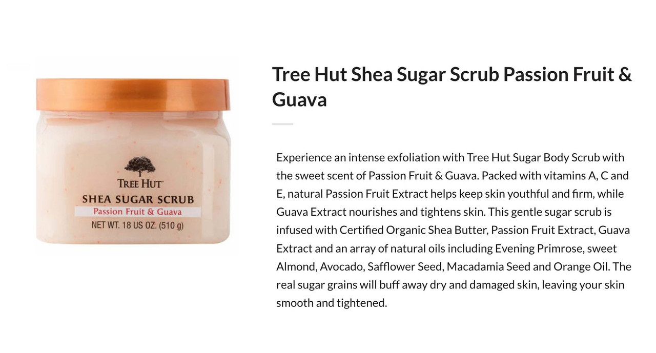 اسکراب بدن شی باتر و شکر تری هات حاوی پشن فروت و گواوا Tree Hut Shea Sugar محصولی فوق العاده جهت پاک سازی سلول های مرده پوست بدن و مرطوب کنندگی قوی می باشد. شی باتر خالص و ارگانیک موجود در اسکراب تری هات مرطوب کننده عمیق پوست بوده و تسکین دهنده و نرم کننده آن می باشد. علاوه بر این پشن فروت و گواوا همراه با رایحه دلپذیر خاصیت سفت کنندگی و افزایش انعطاف پذیری و جوانی پوست را به این اسکراب داده اند.