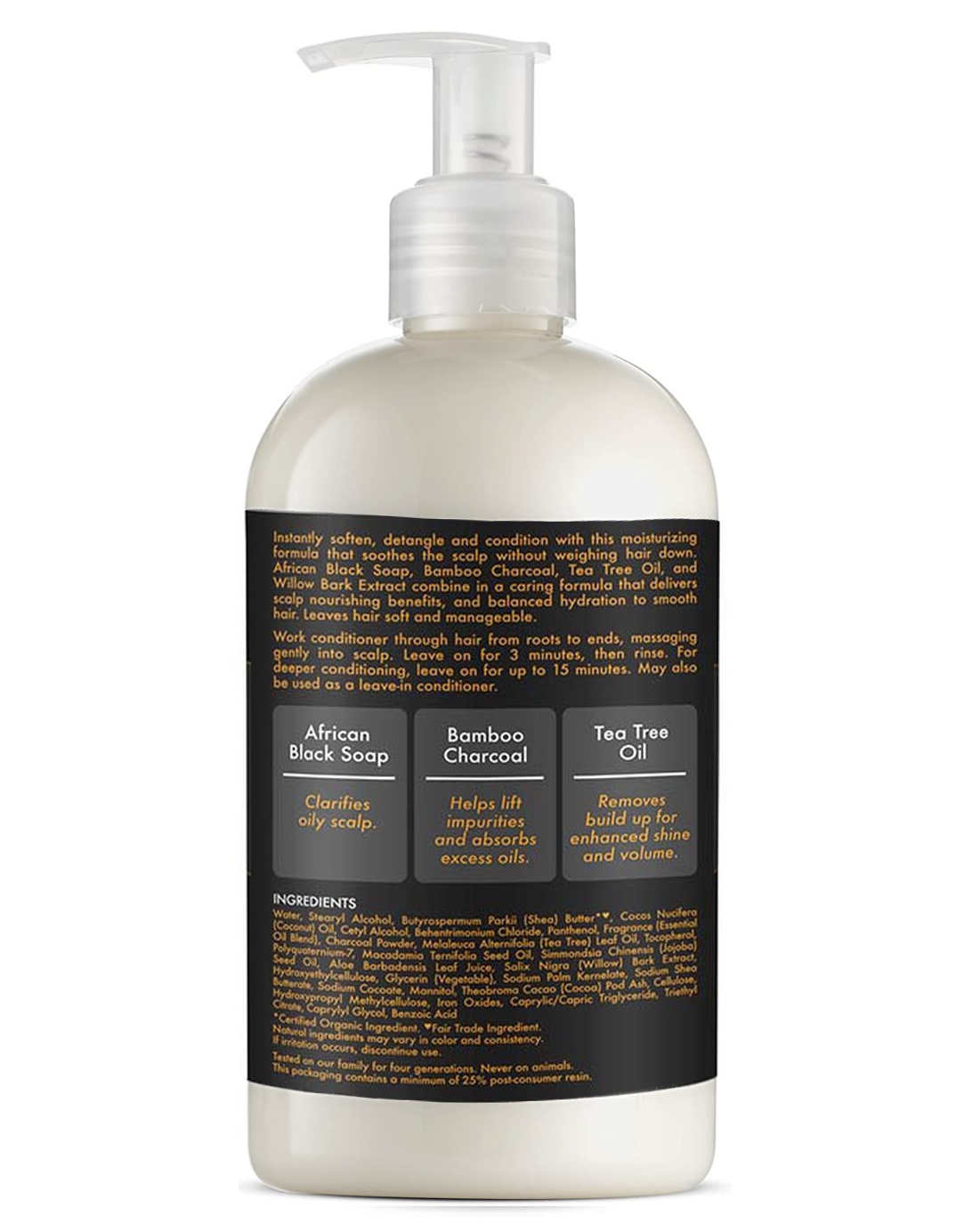 نرم کننده موی ذغال بامبوی شی مویسچر Shea Moisture Bamboo Charcoal محصولی باکیفیت و طبیعی جهت نرم کنندگی عمیق مو، منظم کردن مو، آبرسانی، متعادل سازی و تسکین دهندگی پوست سر بدون ایجاد سنگینی روی موها می باشد. نرم کننده شارکل بامبوی شی مویسچر حاوی مجموعه ای از عصاره های طبیعی از جمله صابون سیاه آفریقایی، ذغال بامبو، روغن درخت چای، پوست درخت بید و شی باتر است که این مجموعه عصاره ها باعث تسریع در آبرسانی و تغذیه موها شده و چربی اضافی و ناخالصی و آلودگی های پوست سر را جذب می کند و نتیجه ی آن موهایی سرزنده، درخشان و سالم خواهد بود.