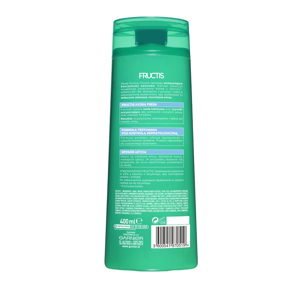 شامپو آبرسان آب نارگیل گارنیه هیدرا فرش Garnier Hydra Fresh دارای فرمول ویژه از لاین فروکتیس گارنیه جهت پاک کنندگی و آبرسانی موهای چرب با ساقه و انتهای خشک می باشد. شامپو هیدرا فرش گارنیه حاوی آب نارگیل جهت آبرسانی کامل موهای دهیدراته و خشک بوده و توسط مواد موثر فعال، پاک کننده چربی اضافی پوست و احیای حس سبکی و تازگی همراه با موهایی آبرسانی شده و سالم می باشد. شامپو هیدرا فرش گارنیه همچنین حاوی پروتئین لیمو، ویتامین B3 و B6 جهت تقویت و استحکام بخشی مو از ریشه تا انتها است.
