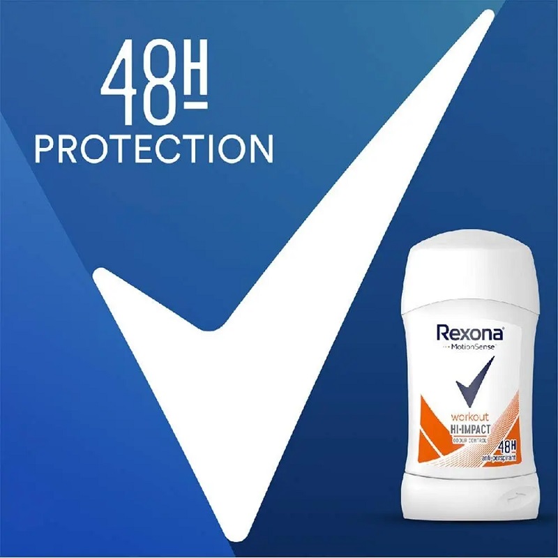استیک ضد تعریق رکسونا Rexona Workout Hi-Impact محافظت کننده 48 ساعته در برابر تعریق و بوی عرق می باشد. استیک ضدتعریق رکسونا همچنین دارای تکنولوژی MotionSense جهت حفظ خشکی زیربغل در حالت حرکت و پرتحرک است. استیک ورک اوت رکسونا محافظت کننده قوی جهت تمرین ورزشی و فعالیت های پرتحرک روزانه است.