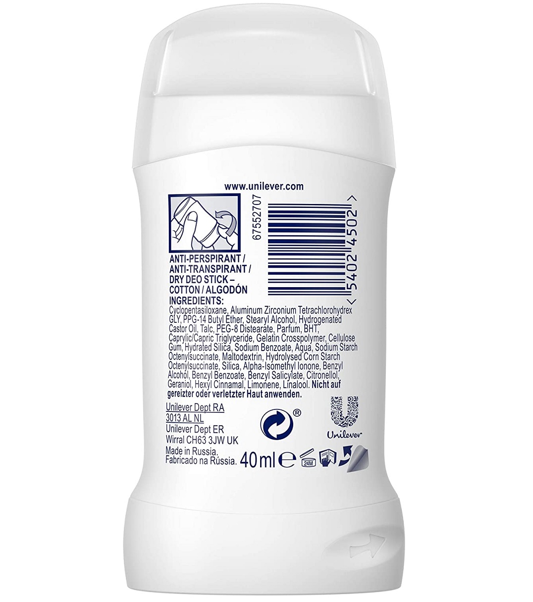 استیک ضد تعریق رکسونا Rexona Cotton Dry محافظت کننده 48 ساعته در برابر تعریق و بوی عرق می باشد. استیک ضدتعریق رکسونا همچنین دارای تکنولوژی MotionSense جهت حفظ خشکی زیربغل در حالت حرکت و پرتحرک است. استیک کتان درای رکسونا دارای فرمول ویژه جهت احساس خشکی و نرمی زیربغل مانند پنبه می باشد و به کمک رایحه گلی حس لطیف و دلپذیری را فراهم می کند.