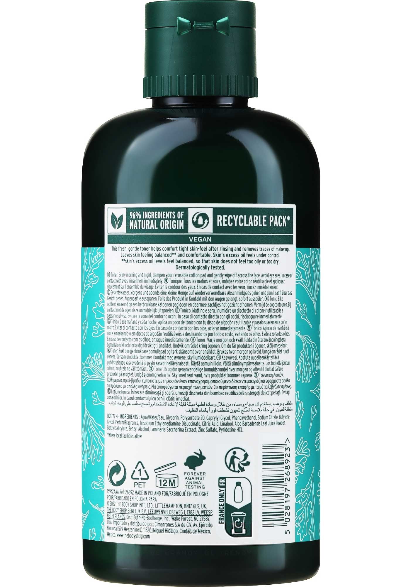 تونر متعادل کننده جلبک دریایی بادی شاپ The Body Shop Seaweed محصولی باکیفیت جهت تنظیم تعادل چربی پوست و احیای سرزندگی و نشاط پوست می باشد. تونر متعادل کننده بادی شاپ حاوی جلبک دریایی بدست آمده از آب های خروشان ایرلند غنی از مواد معدنی بوده و ضمن پاک کنندگی بقایای آلودگی ها و ناخالصی های پوست دارای فرمول بدون الکل است و تصفیه کننده و طراوت بخش پوست های مختلط و چرب محسوب می شود. تونر جلبک دریایی بادی شاپ علاوه بر این حاوی عصاره خیار جهت رطوبت رسانی و طراوت بخشی پوست می باشد که به پوست صورتمان زندگی دوباره می بخشد.