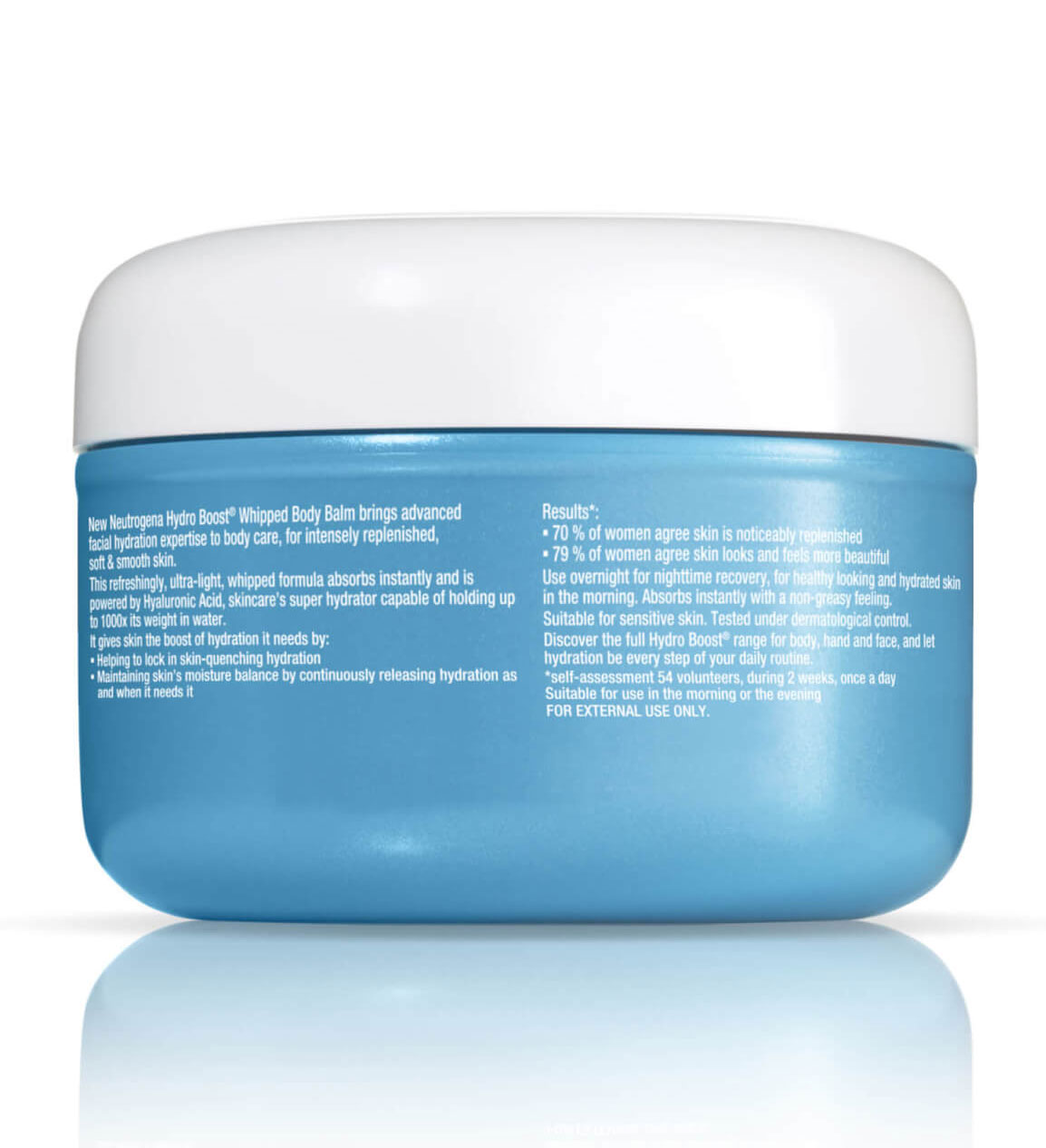 بالم مرطوب کننده بدن نوتروژنا Neutrogena Hyro Boost Whipped Balm  دارای فرمول توسعه یافته توسط متخصصین پوست جهت آبرسانی قوی پوست بدن خشک و خیلی خشک می باشد. بالم دارای فرمول غنی تر از کرم بوده که برای نگهداری و محافظ از رطوبت لایه های پوست در مناطق خشک و ضخیم پوست بسیار مناسب می باشد. بالم آبرسان بدن نوتروژنا حاوی هیالورونیک اسید به عنوان آبرسانی قوی با توانایی جذب رطوبت 1000 برابر وزن ملکولی آن است. این فرمول با رهاسازی پیوسته و تدریجی رطوبت باعث تنظیم تعادل رطوبت پوست در طول روز و طولانی مدت می شود، علاوه بر این جذب سریع و عدم احساس چرب کنندگی محصولی ضروری را جهت مراقبت از شادابی و لطافت پوست های خشک و حساس به ارمغان آورده است.