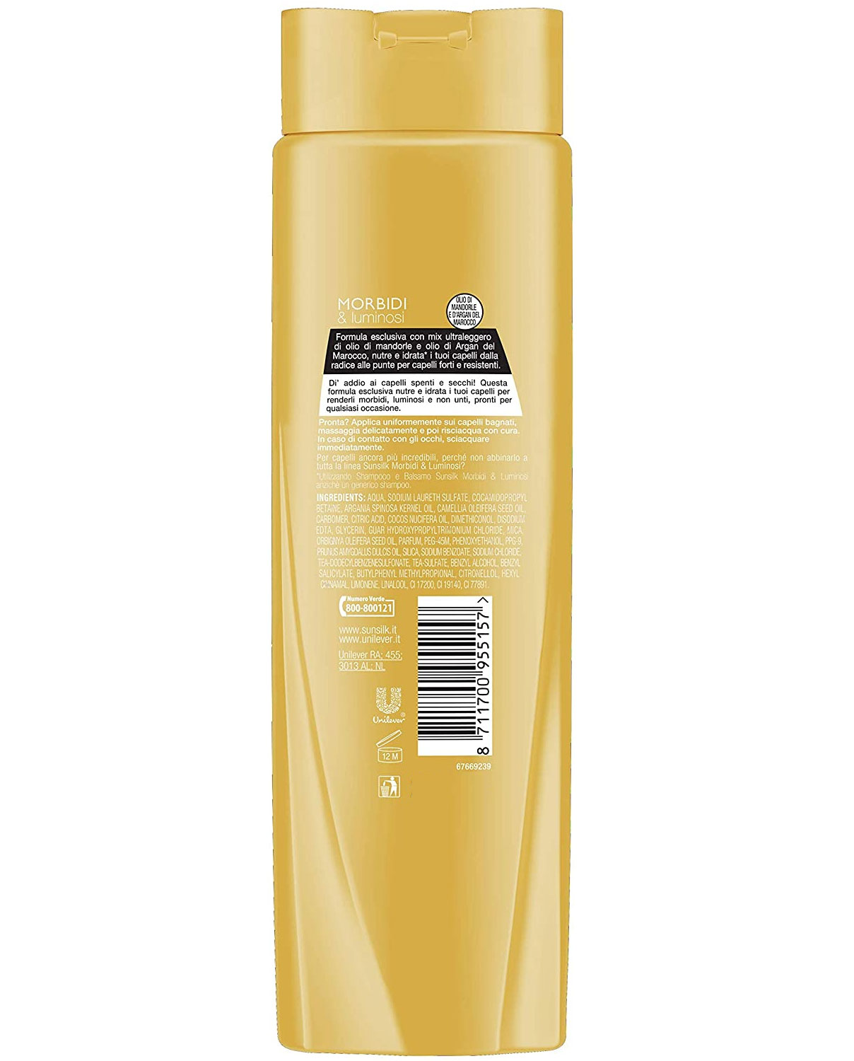 شامپو نرم کننده و درخشان کننده آرگان و بادام سان سیلک Sunsilk Morbidi حاوی عصاره های طبیعی با فرمول انحصاری جهت احیای نرمی و درخشندگی موهای خشک و کدر می باشد. شامپو نرم کننده سان سیلک حاوی روغن بادام جهت تغذیه و درخشندگی موها و روغن آرگان مراکشی جهت نرمی، رطوبت رسانی و احیای سرزندگی موهای خشک و نیازمند تغذیه می باشد. این فرمول بدون احساس چربی، رطوبت رسانی موها را انجام داده و موهایی خوش حالت، نرم و براق را به ارمغان می آورد.