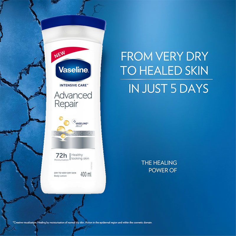 لوسیون بدن وازلین Vaseline Advanced Repair دارای فرمول غنی از مواد رطوبت رسان جهت رفع خشکی پوست های خیلی خشک در طی 5 روز می باشد. پوست های خیلی خشک، ملتهب و حساس نیازمند آبرسانی سریع و قوی و تسکین دارند، لوسیون اینتنسیو وازلین حاوی میکرو ذرات ژل وازلین به همراه بالاترین سطح گلیسیرن جهت رطوبت رسانی و تسکین خشکی، خارش و التهاب پوست های حساس می باشد. لوسیون بدن ادونس ریپیر وازلین برنده جایزه انجمن ملی اگزمای آمریکا در خصوص رفع خشکی و حساسیت های پوستی منجر به ایجاد اگزا شده است. این مزایا در کنار جذب شوندگی سریع و بدون احساس چربی محصولی کاربردی و دوست داشتنی را پدید آورده است.