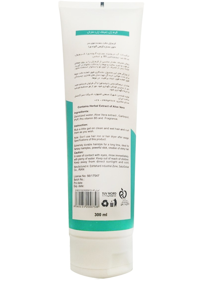 میلک ژل مارال حاوی عصاره آلوئه ورا جهت طراوت و شادابی موها، مناسب جهت موهای فر و حالت دار، بدون ایجاد شکنندگی در موها، خشک شدن سریع، ماندگاری فوق العاده حالت موها، این محصول ضمن حفظ سلامت کامل مو اثر طولانی مدت 24 ساعته دارد.