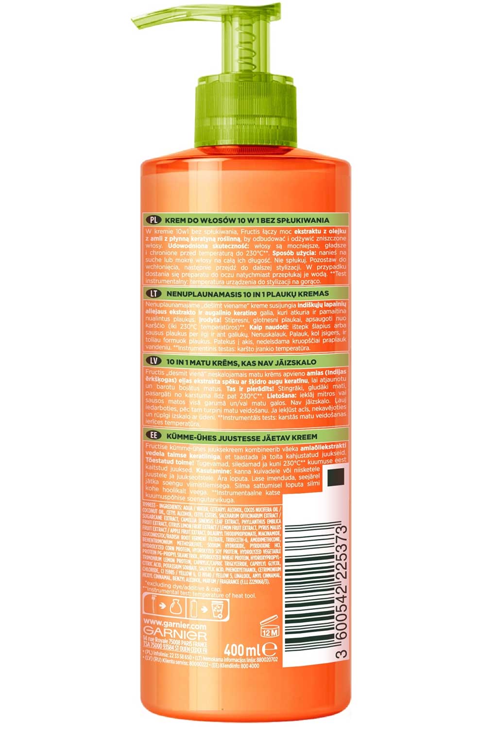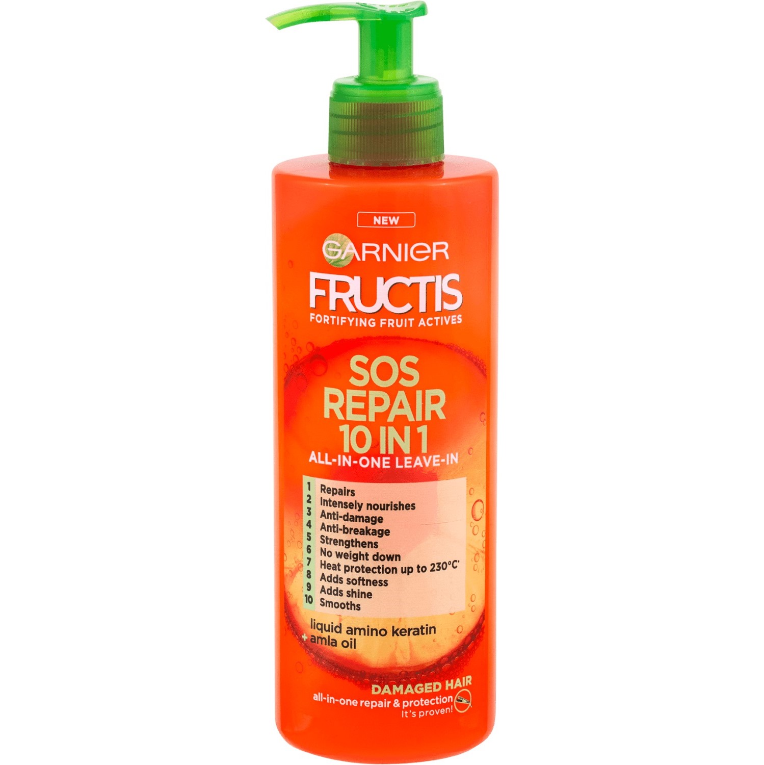 کرم موی ترمیم کننده 10 کاره گارنیه Garnier Goodbye Damage محصولی همه کاره است که ترمیم کننده آسیب دیدگی و مراقبت کننده مو در برابر عوامل آسیب رسان می باشد. کرم موی گارنیه حاوی آمینو کراتین مایع جهت تقویت و ترمیم ساختار مو و روغن میوه املا جهت تغذیه و نرمی موها است، نتیجه موهایی منظم و شانه پذیری آسان مو همراه با نرمی و سلامت آن است.