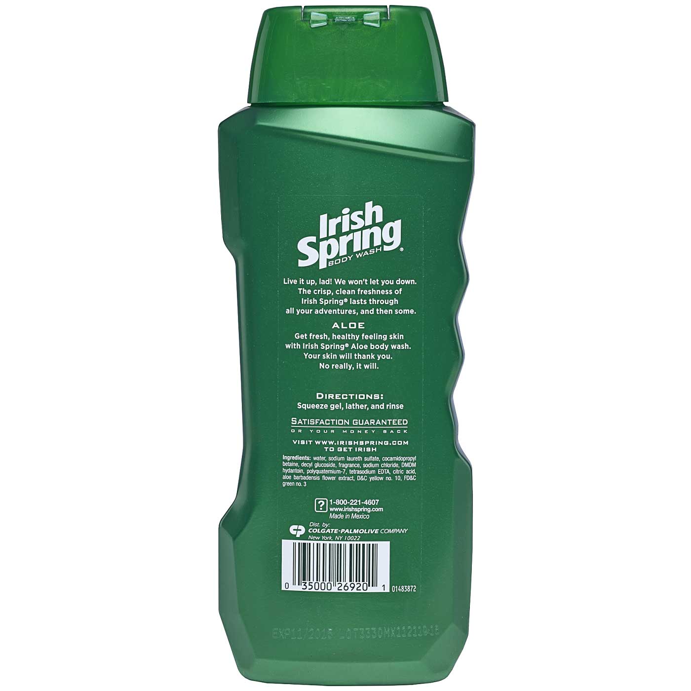 ژل دوش آقایان ایریش اسپرینگ آلوئه ورا Irish Spring Aloe حاوی عصاره آلوئه ورا جهت حفظ رطوبت پوست و همچنین تسکین دهندگی پوست و احساس سلامتی و شادابی بدن می باشد. ژل دوش آلوئه ورای ایریش اسپرینگ دارای فرمول طراوت بخش به منظور احساس تازگی طولانی مدت و 24 ساعته است. تازگی شامپو بدن ایریش اسپرینگ مانند قرار گیری زیر آبشار خنک و پرطراوت در میانه طبیعت تازه و باطراوت ایرلند است، علاوه بر این تکنولوژی خنثی سازی بوی نامتبوع عرق، محافظت کننده 24 ساعته تازگی شماست.