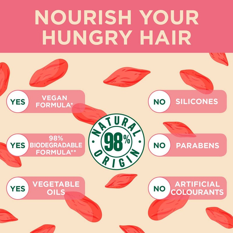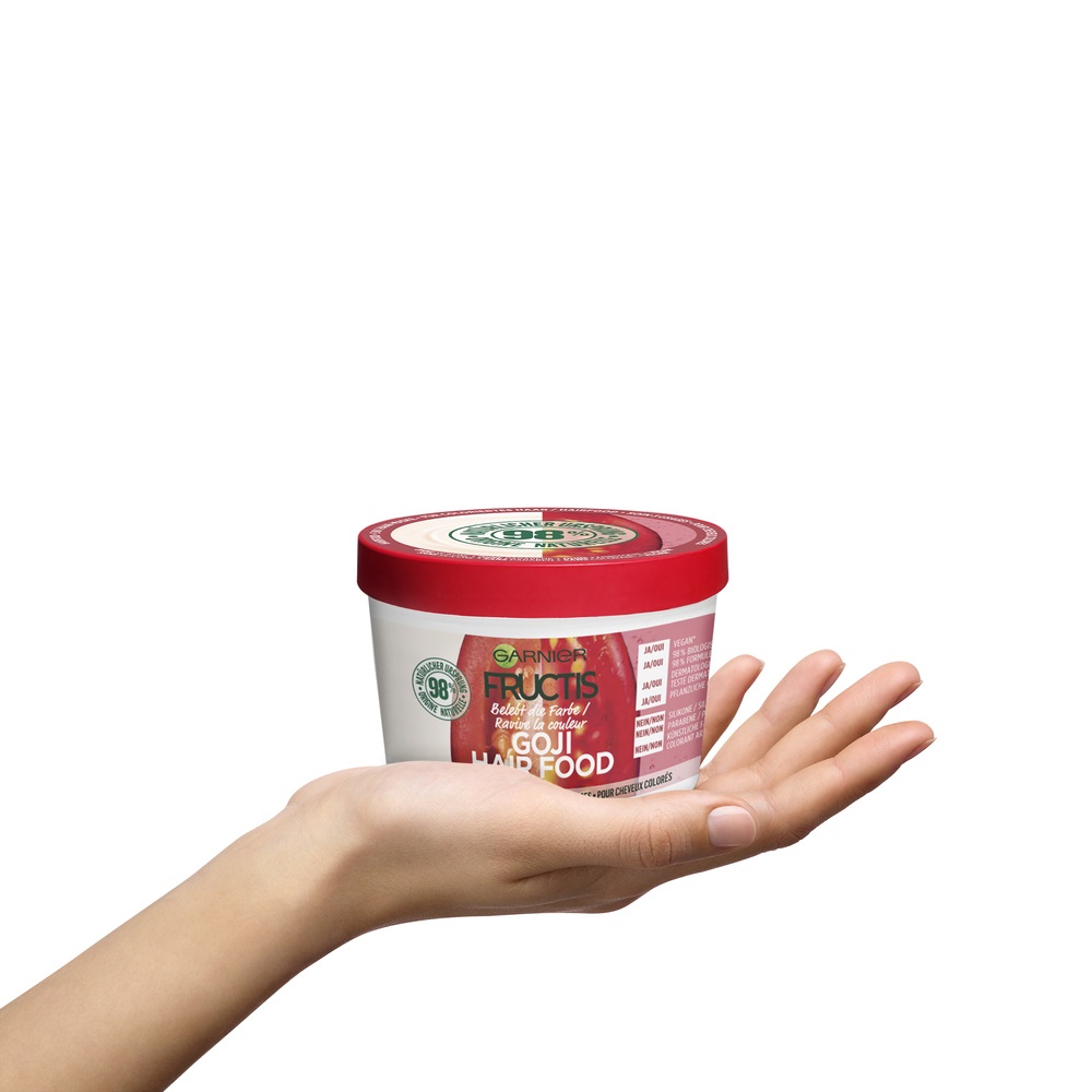 ماسک موهای رنگ شده گوجی بری گارنیه هیر فود Garnier Goji دارای فرمول باکیفیت حاوی 98 درصد عصاره های طبیعی بوده و هر آنچه موهای گرسنه رنگ شده نیاز دارد را برطرف می کند. ماسک موی گارنیه هیر فود درخشندگی موهای رنگ شده را زنده می کند و از آسیب دیدگی آن ها محافظت کرده و موها را احیا و سالم می کند. ماسک موی هیر فود گارنیه دارای سه عملکرد است که قابل استفاده به صورت نرم کننده قوی، ماسک مو و کرم موی بعد از حمام می باشد. عصاره گوجی بری سرشار از آنتی اکسیدان است و درخشان کننده و افزایش دهنده کیفیت رنگدانه های مو می باشد، علاوه بر این روغن سویا و روغن نارگیل موجود در ماسک موی گارنیه تغذیه کننده و نرم کننده قوی مو است و خشکی موها را برطرف می کند.