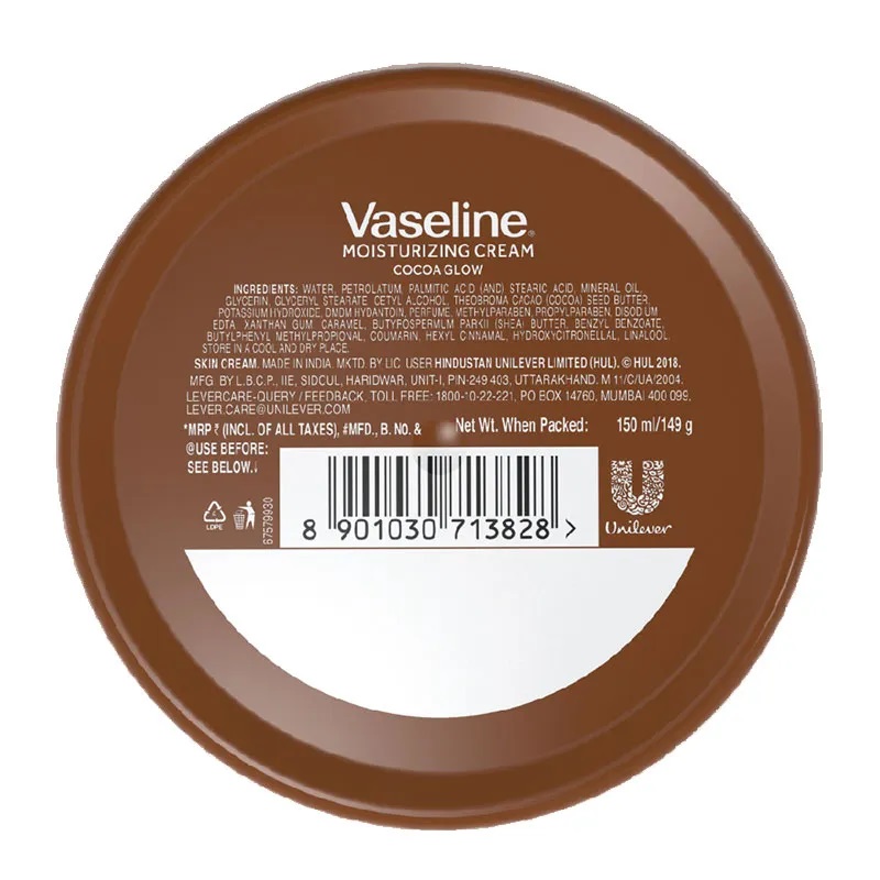 کرم مرطوب کننده و درخشان کننده بدن وازلین Vaseline Cocoa Glow دارای فرمول مغذی جهت تغذیه قوی و احساس پوستی نرم و درخشان می باشد. کرم بدن وازلین حاوی کره کاکائوی خالص جهت افزایش شفافیت و درخشندگی پوست به همراه شی باتر جهت تغذیه قوی و نرم کنندگی پوست است. علاوه بر این گلیسیرین جهت رطوبت رسانی و میکرو ذرات ژلی وازلین جهت رفع خشکی پوست می باشد. این فرمول تایید شده کلینیکال است و بدون احساس سنگینی، خشکی پوست را پس از اولین استفاده برطرف می کند.