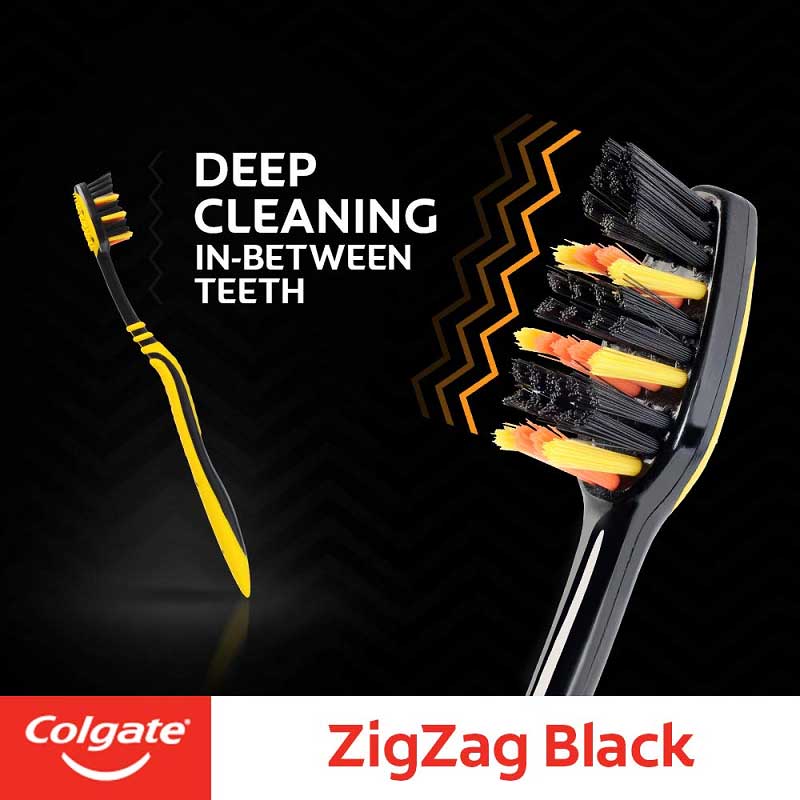 مسواک مدیوم ذغالی کلگیت زیگزاگ Colgate Zig Zag Charcoal دارای برس دندانه ای با سر V شکل جهت پاک کنندگی بیشتر فضای بین دندانی می باشد. مسواک زیگزاک کلگیت همچنین حاوی ذغال فعال شارکل جهت پاک کنندگی بیشتر و از بین بردن باکتری های دهان است و سر برس های آن جهت ملایمت بیشتر با لثه و دندان گرد است، همه این ها به همراه طراحی ارگونومیک، سر منعطف شونده و پاک کننده زبان در پشت مسواک، محصولی کاربردی را حاصل شده است.