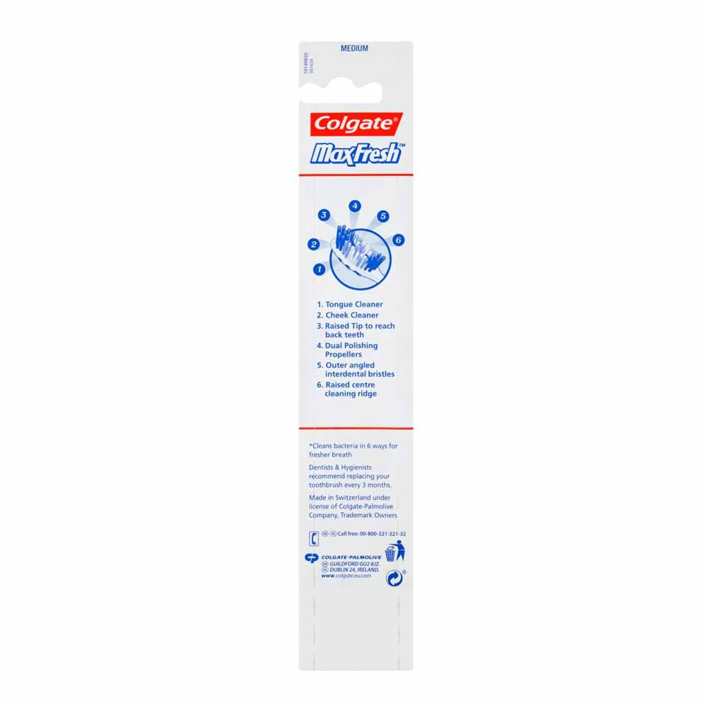 مسواک مدیوم کلگیت مکس فرش Colgate MaxFresh دارای تارهای برس با اندازه های و جهت های متفاوت جهت 6 عملکرد متنوع است که منجر به پاک کنندگی فضاهای مختلف بین دندانی و ایجاد حس تازگی چندبعدی می شود. مسواک مکس فرش کلگیت علاوه این دارای پاک کننده زبان در پشت آن بوده که محصولی کاربردی را حاصل شده است.