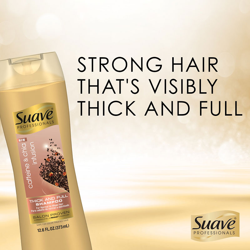 شامپو کافئین و دانه چیا سواو Suave Thick and Full دارای فرمول انرژی دهنده جهت استحکام بخشی و افزایش ضخامت و حجم مو می باشد. این فرمول با ایجاد پوشش در اطراف فیبر مو از ریشه تا انتها باعث افزایش ضخامت و استحکام مو شده و از موها در برابر شکنندگی محافظت می کند. دانه چیا دارای خواص تغذیه کنندگی و استحکام بخشی مو است و کافئین نیز انرژی دهنده و تقویت کننده موهای نازک است.