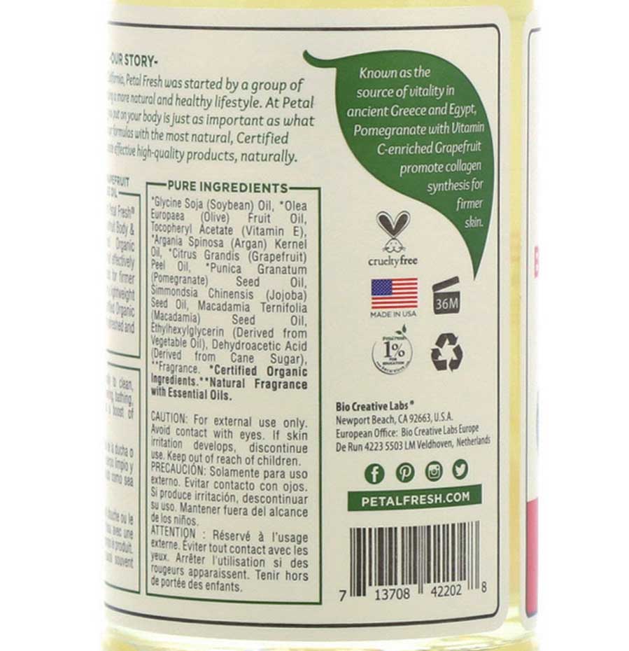 روغن ماساژ بدن انار و گریپ فروت پتال فرش Petal Fresh Firming محصولی باکیفیت و ارگانیک جهت ماساژ بدن به همراه تقویت و افزایش سفتی پوست، افزایش تولید کلاژن و استحکام پوست می باشد. روغن ماساژ بدن انار و گریپ فروت پتال فرش علاوه بر روغن های میوه ای حاوی روغن آرگان ارگانیک، روغن زیتون ارگانیک، روغن جوجوبا و روغن ماکادمیا جهت تغذیه، لطافت و نرمی هر چه بیشتر پوست می باشد. انار به عنوان منبع جوانی و سرشار از آنتی اکسیدان شناخته می شود و گریپ فروت نیز بیشتر مقدار ویتامین C را دارد و عصاره این دو میوه در کنار هم جوانی و استحکام پوست را به ارمغان می آورد.