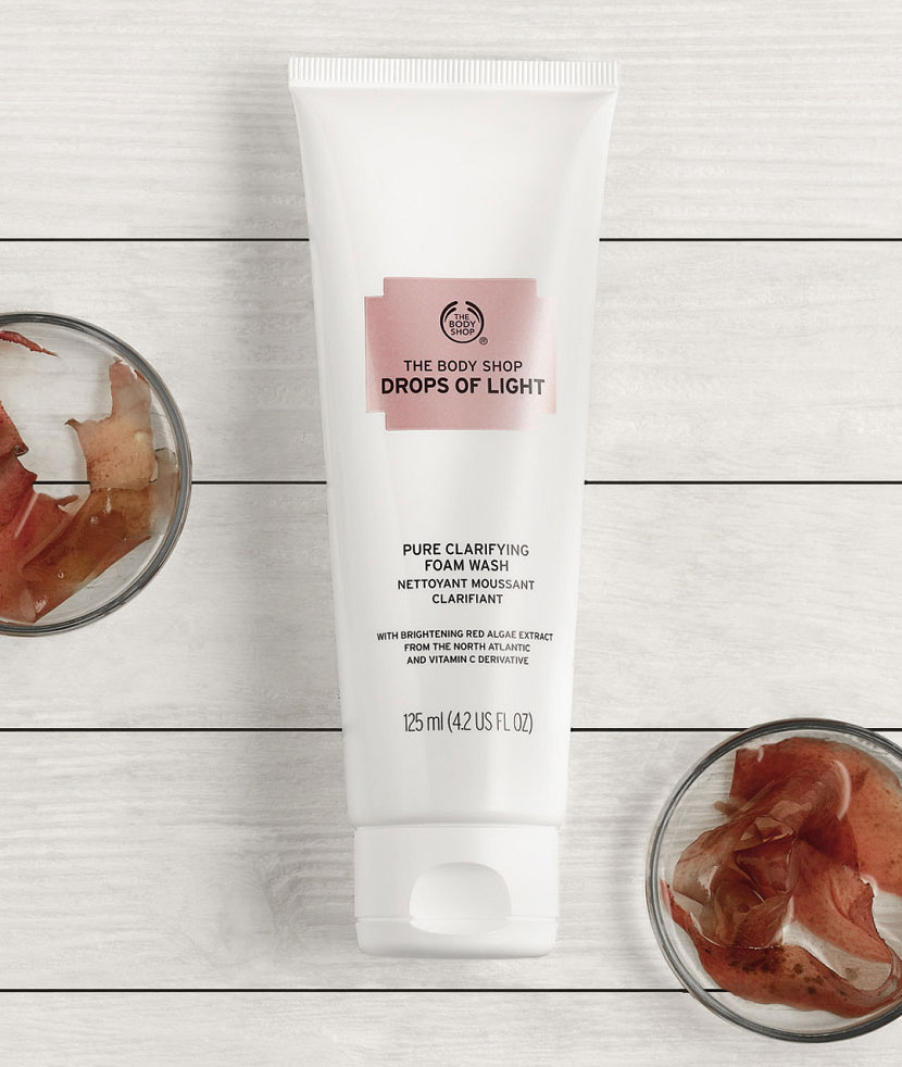 فوم شوینده و روشن کننده صورت بادی شاپ Body Shop Drops of Light حاوی مواد موثر روشن کننده از جمله جلبک دریایی قرمز بدست آمده از آب های اقیانوس اطلس شمالی جهت افزایش شفافیت و روشنایی پوست و همچنین ویتامین C با خواص روشن کنندگی پوست می باشد. فوم پاک کننده بادی شاپ دارای بافت کرمی و غنی است و بدون ایجاد خشکی پوست، پاک کنندگی و خالص سازی را به خوبی انجام می دهد و پوستی هموار، شفاف و لطیف را به ارمغان می آورد.