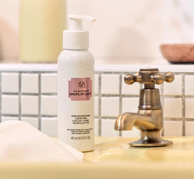 ژل لایه بردار و روشن کننده صورت بادی شاپ Body Shop Drops of Light حاوی مواد موثر روشن کننده از جمله جلبک دریایی قرمز بدست آمده از آب های اقیانوس اطلس شمالی جهت افزایش شفافیت و روشنایی پوست و همچنین ویتامین C با خواص روشن کنندگی پوست می باشد. لایه بردار بادی شاپ دارای فناوری تبدیل ژل به دانه های لایه بردار است و با پاک کنندگی سلول های مرده پوست به نوسازی سلولی کمک کرده و سطح هموار و شفاف پوست را تجدید می کند.