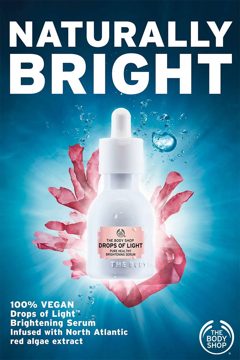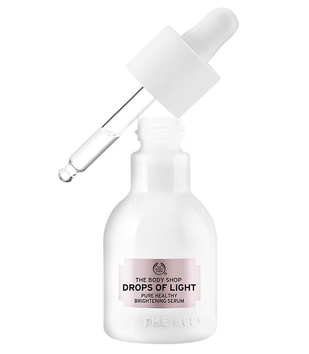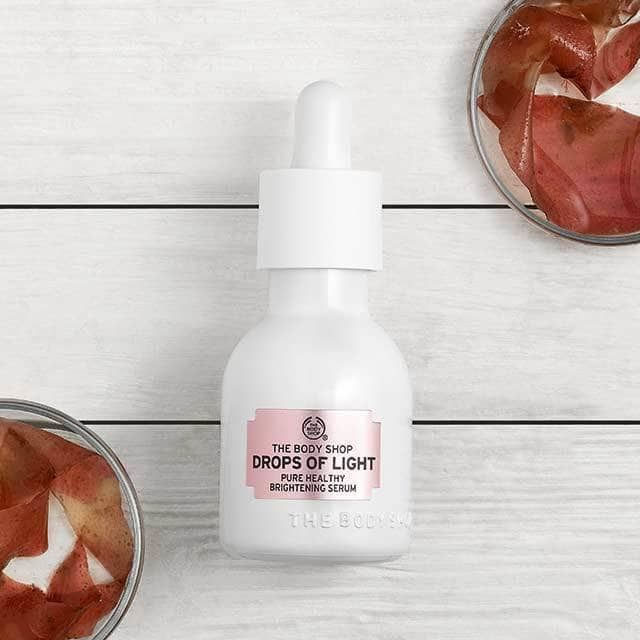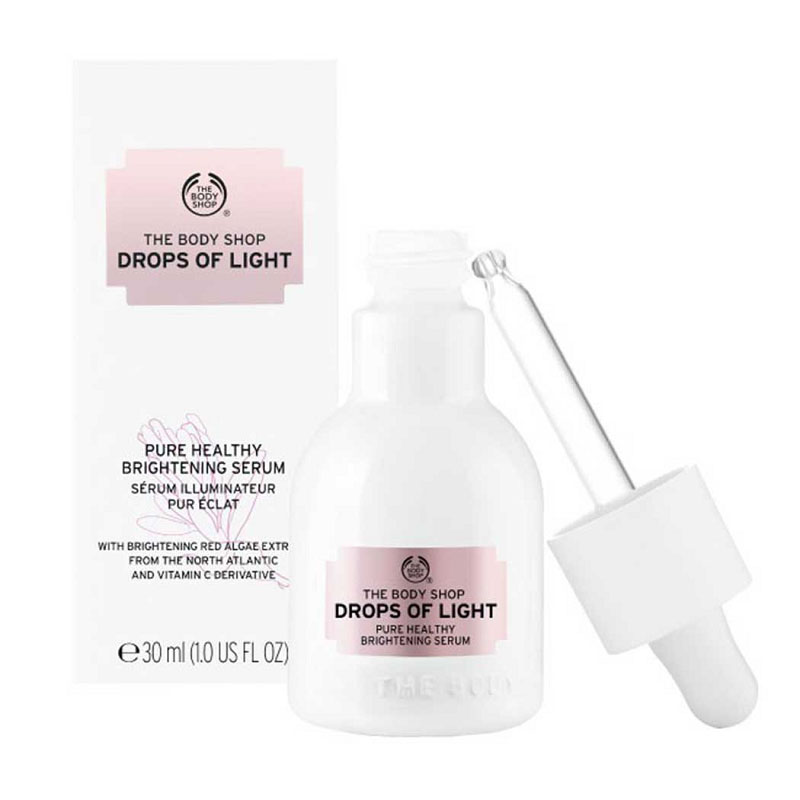 سرم روشن کننده صورت بادی شاپ Body Shop Drops of Light حاوی مواد موثر روشن کننده از جمله جلبک دریایی قرمز بدست آمده از آب های اقیانوس اطلس شمالی جهت افزایش شفافیت و روشنایی پوست و همچنین ویتامین C با خواص روشن کنندگی پوست می باشد. سرم دروپ آو لایت بادی شاپ دارای بافت سبک با جذب شوندگی سریع بوده و باعث افزایش روشنایی و شفافیت پوست های کدر می شود، نتیجه احساس درخشندگی و روشنایی پوست روز به روز می باشد.