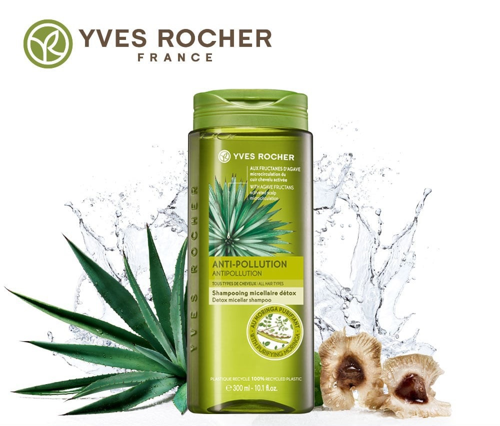 شامپو سم زدا و ضد آلودگی ایوروشه Yves Rocher Anti Pollution حاوی عصاره های طبیعی جهت پاک کنندگی ناخالصی ها و آلودگی های محیطی روزانه از میان تارهای مو و کف سر می باشد. شامپو سم زدای ایوروشه حاوی عصاره دانه مورینگا (گز روغنی) جهت تصفیه و پاک کنندگی ملایم به همراه ملکول های میسلار می باشد. ملکلول های میسلار مانند آهنربا جاذب آلودگی و ناخالصی های پوست و مو هستند و نتیجه تمیز، سالم و شاداب خواهد بود. علاوه بر این عصاره کلیدی دیگر این فرمول عصاره ارگانیک گیاه آگاو است که گردش خون کف سر را دو برابر افزایش می دهد و موجب رشد موهایی مستحکم تر می شود. آگاو گیاهی شبیه کاکتوس و آلوئه ورا است که در مکزیک پرورش داده می شود و غنی از فروکتوز می باشد.