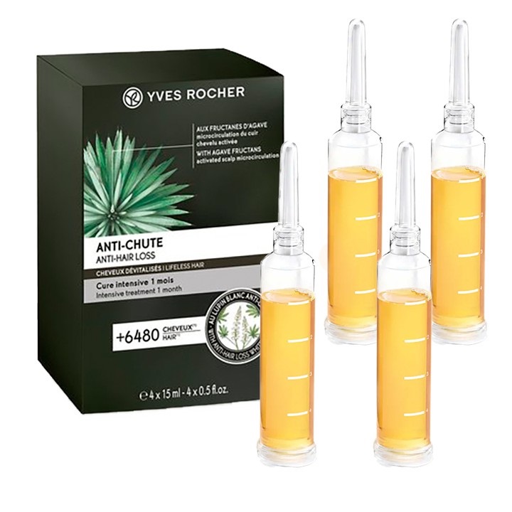 ویال ضد ریزش موی ایوروشه آنتی شوت Yves Rocher Anti Chute حاوی چهار ویال به عنوان درمان قوی یک ماهه جهت مقابله با ریزش مو و افزایش رشد مو می باشد. مجموعه ضدریزش موی ایوروشه دارای فرمول بدست آمده از عصاره های گیاهی با سه ویژگی افزایش تراکم موها، تسریع رشد مو و کاهش ریزش مو می باشد. ویال ضدریزش ایوروشه حاوی پروتئین لوبیای سفید فرانسوی جهت مقابله با ریزش مو از طریق کاهش فعالیت آنزیم Reductase (مسئول ریزش مو) و افزایش اکسیژن رسانی به پوست سر می باشد. طبق نتایج آزمایشگاهی این فرمول باعث افزایش 6480 عددی تارهای در حال رشد (فاز رشد مو) می شود. علاوه بر این عصاره کلیدی دیگر این فرمول عصاره ارگانیک گیاه آگاو است که گردش خون کف سر را دو برابر افزایش می دهد و موجب رشد موهایی مستحکم تر می شود. آگاو گیاهی شبیه کاکتوس و آلوئه ورا است که در مکزیک پرورش داده می شود و غنی از فروکتوز می باشد.