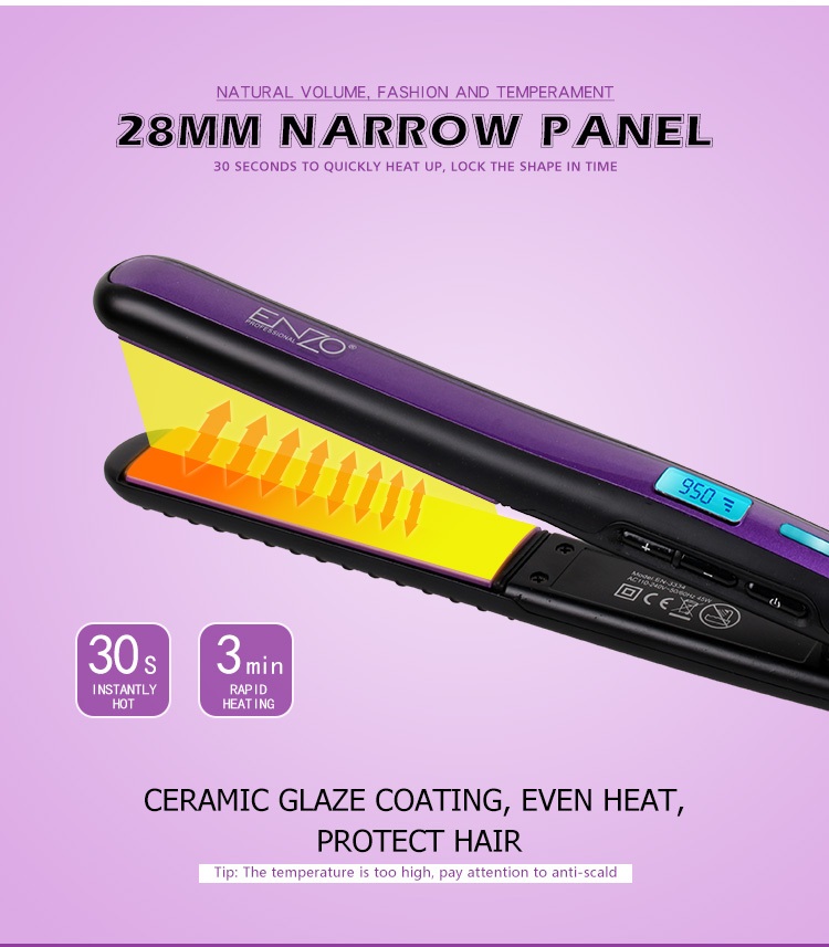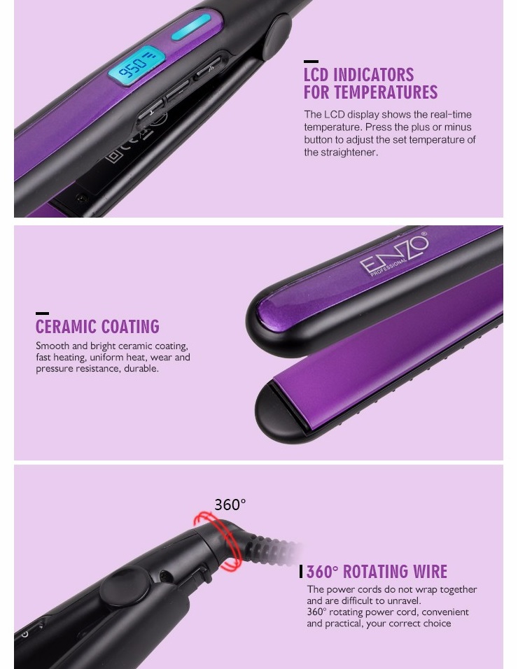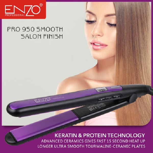 اتو موی انزو پروفشنال Enzo Pro 950 دارای صفحات سرامیک تورمالین جهت محافظت از موها به همراه عرض 28 میلی متر و طول بلند جهت استفاده حرفه ای و آسان و حالت دهی موهای صاف، موجدار و فر می باشد. صفحات سرامیکی اتو موی انزو پروفشنال جهت کمترین استحکاک و استفاده آسان و درخشان کنندگی موها می باشد. علاوه بر این درجه حرارت قابل تنظیم به همراه نمایشگر LED از دیگر ویژگی های قابل توجه Pro 950 است. علاوه بر این ویژگی مهم دیگر آن طراحی لبه صفحات به صورت گرد است که برای ایجاد فرهای زیبا بسیار مناسب است.