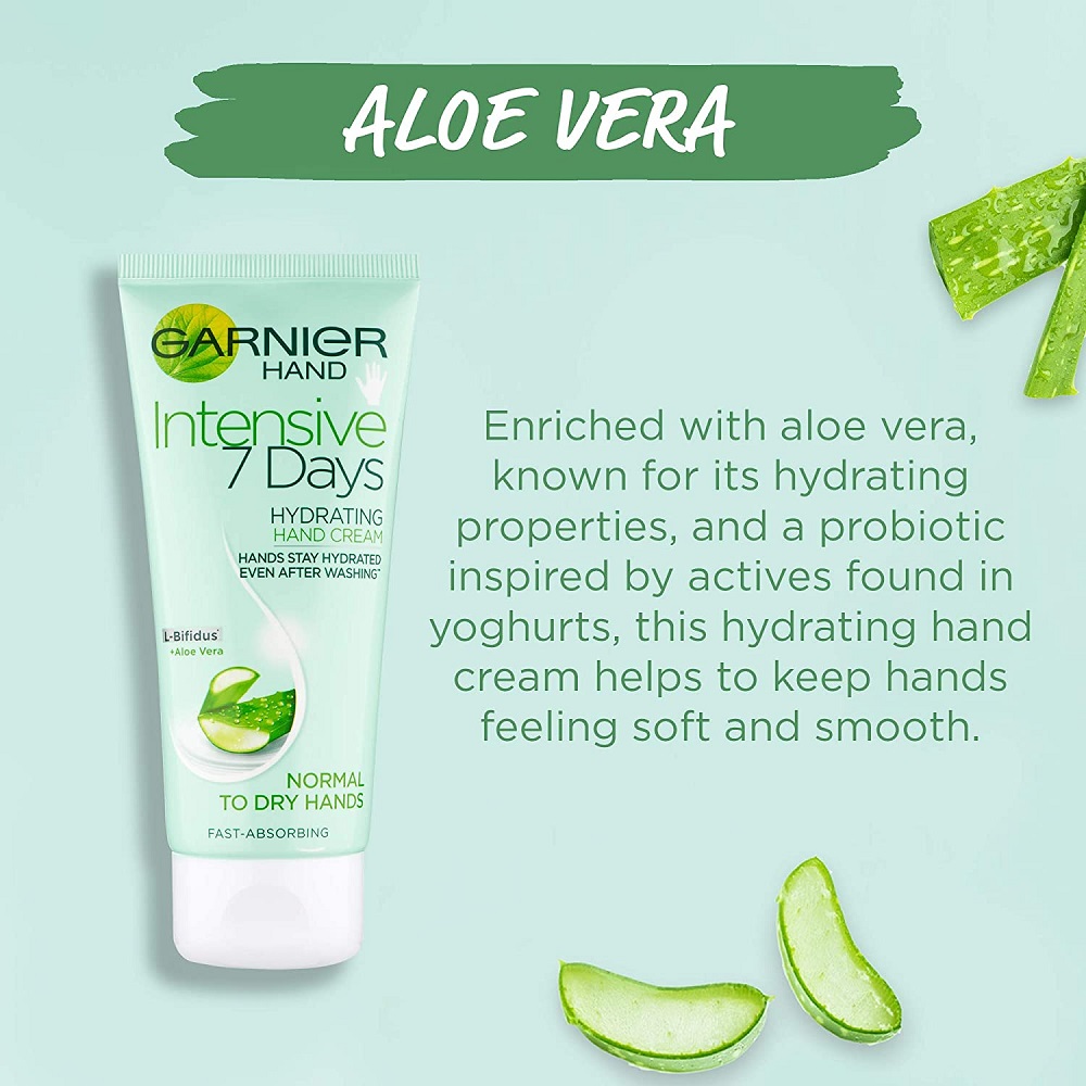 کرم آبرسان دست آلوئه ورای گارنیه Garnier Intensive 7 Days حاوی آلوئه ورا غنی از ویتامین ها، مواد معدنی و با خواص آبرسانی پوست دست به همراه باکتری پروبیوتیک بیفیدو بدست آمده از ماست جهت بازسازی و حفظ رطوبت پوست می باشد. آلوئه ورا با توانایی نگهداری طولانی مدت رطوبت، عصاره کلیدی بسیار مفید پوست به شمار می رود. کرم مغذی قوی کرم دست گارنیه پس از 7 روز 37 درصد خشکی پوست را کاهش می دهد و پوستی نرم و آبرسانی شده را به ارمغان می آورد. این فرمول پس از شستشوی دست نیز پوست را آبرسانی شده نگاه می دارد و ضمن جذب شوندگی سریع و بدون احساس چسبندگی برای پوست های نرمال و خشک مناسب است.